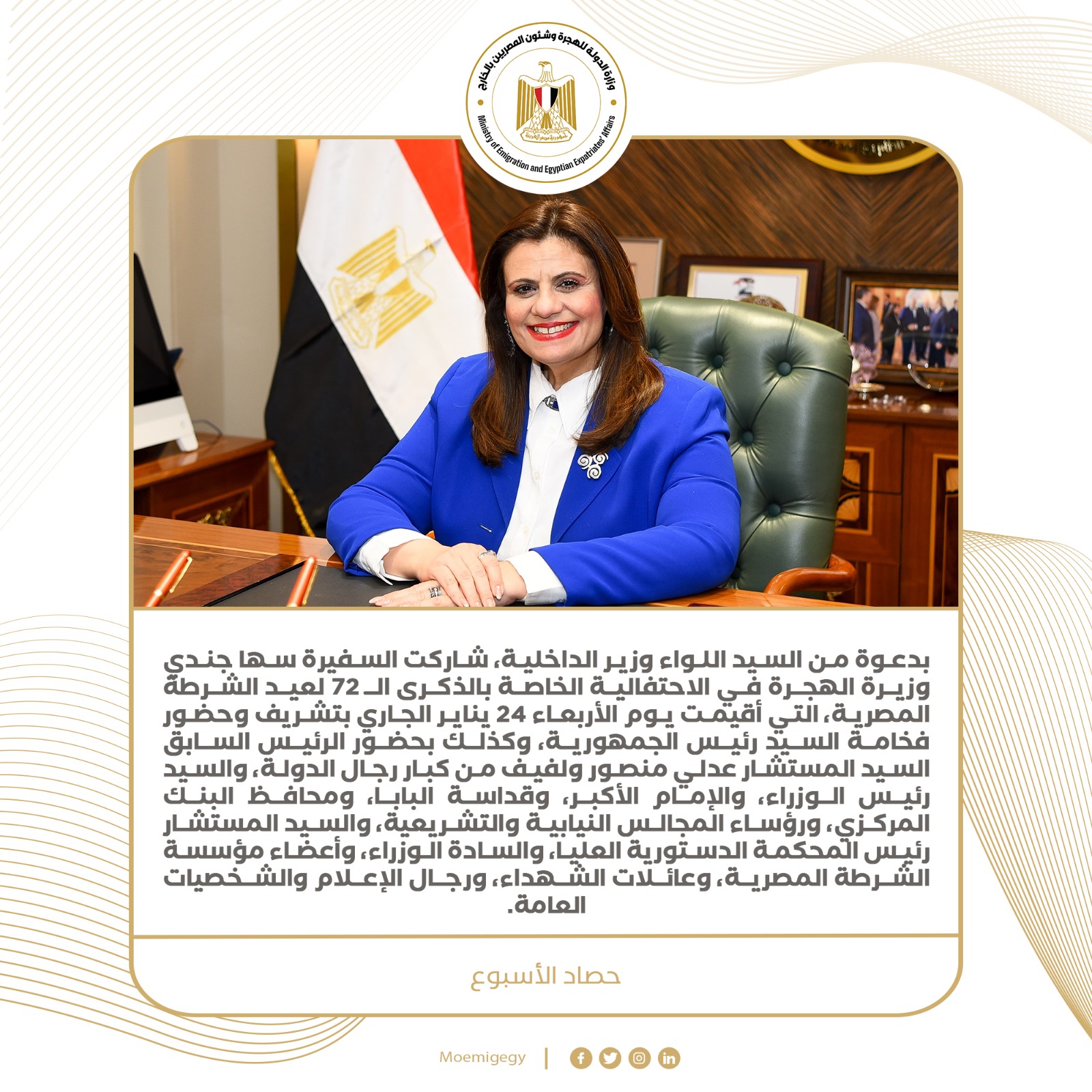 بدعوة من اللواء وزير الداخلية، شاركت السفيرة سها جندي وزيرة الهجرة في الاحتفالية الخاصة بالذكرى الـ 72 لعيد الشرطة المصرية، التي أقيمت يوم الأربعاء 24 يناير الجاري بتشريف وحضور رئيس الجمهورية، وكذلك بحضور الرئيس السابق عدلي منصور ولفيف من كبار رجال الدولة، ورئيس الوزراء، والإمام الأكبر، وقداسة البابا، ومحافظ البنك المركزي، ورؤساء المجالس النيابية والتشريعية، والسيد المستشار رئيس المحكمة الدستورية العليا، والسادة الوزراء، وأعضاء مؤسسة الشرطة المصرية، وعائلات الشهداء، ورجال الإعلام والشخصيات العامة.