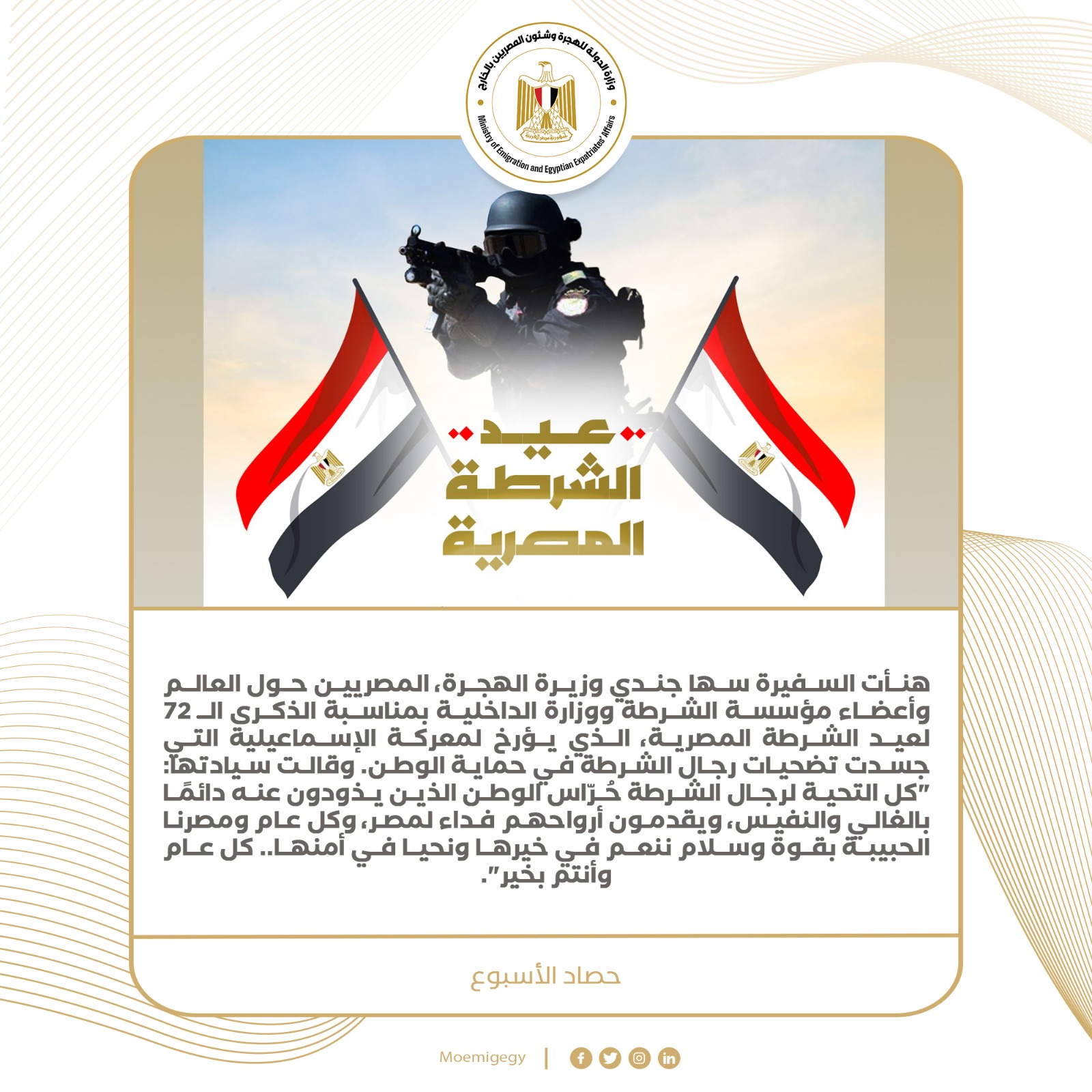 2- هنأت السفيرة سها جندي وزيرة الهجرة، المصريين حول العالم وأعضاء مؤسسة الشرطة ووزارة الداخلية بمناسبة الذكرى الـ 72 لعيد الشرطة المصرية، الذي يؤرخ لمعركة الإسماعيلية التي جسدت تضحيات رجال الشرطة في حماية الوطن. وقالت سيادتها: "كل التحية لرجال الشرطة حُرّاس الوطن الذين يذودون عنه دائمًا بالغالي والنفيس، ويقدمون أرواحهم فداء لمصر، وكل عام ومصرنا الحبيبة بقوة وسلام ننعم في خيرها ونحيا في أمنها.. كل عام وأنتم بخير".