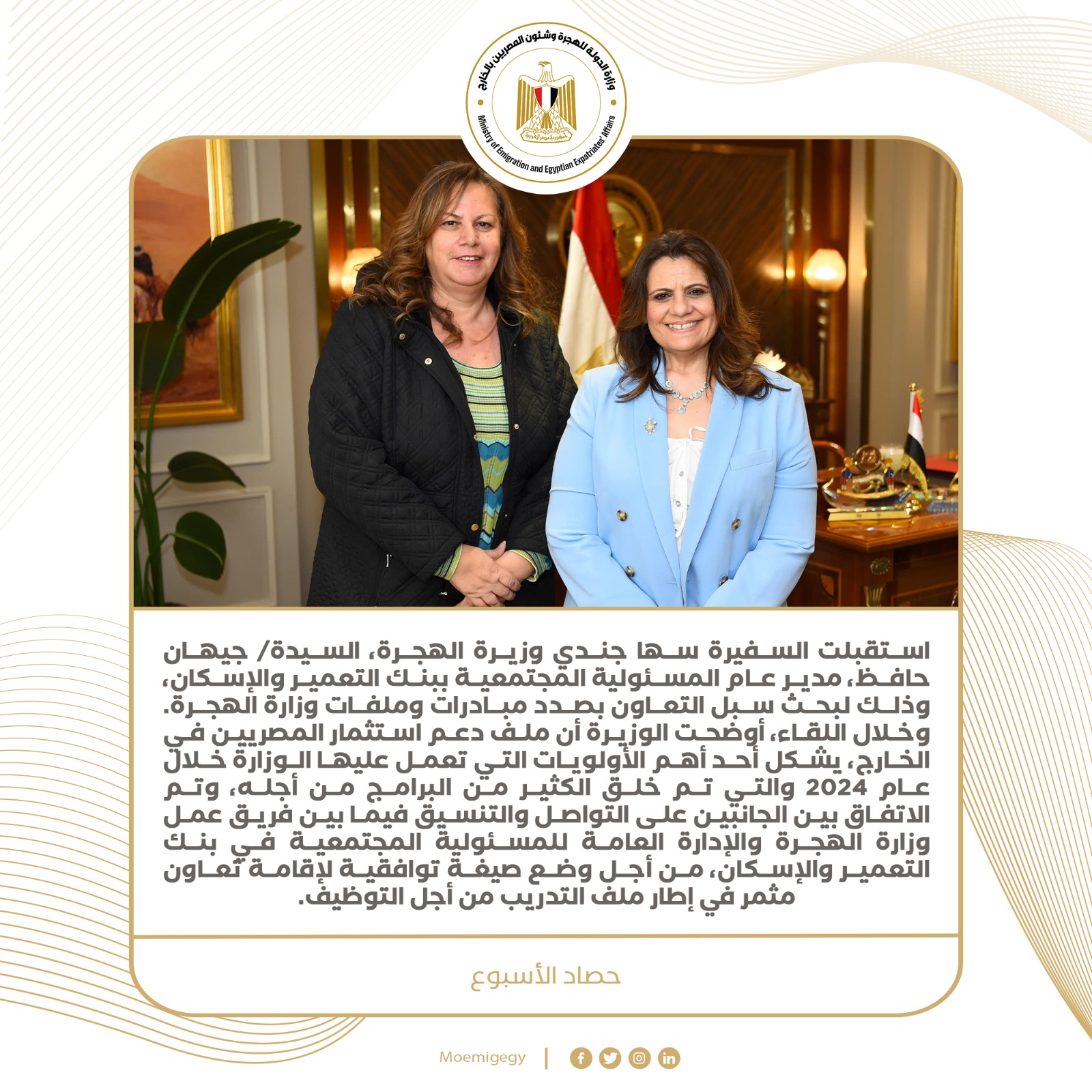 3- استقبلت السفيرة سها جندي وزيرة الهجرة، السيدة/ جيهان حافظ، مدير عام المسئولية المجتمعية ببنك التعمير والإسكان، وذلك لبحث سبل التعاون بصدد مبادرات وملفات وزارة الهجرة. وخلال اللقاء، أوضحت الوزيرة أن ملف دعم استثمار المصريين في الخارج، يشكل أحد أهم الأولويات التي تعمل عليها الوزارة خلال عام 2024 والتي تم خلق الكثير من البرامج من أجله، مضيفة أنه سيتم تقديم مزيد من البرامج والمحفزات الادخارية التي تشكل خدمات أساسية للمصريين في الخارج، وتشجيعهم على زيادة استثماراتهم وتحويلاتهم بالعملة الصعبة. وتم الاتفاق بين الجانبين على التواصل والتنسيق فيما بين فريق عمل وزارة الهجرة والإدارة العامة للمسئولية المجتمعية في بنك التعمير والإسكان، من أجل وضع صيغة توافقية لإقامة تعاون مثمر في إطار ملف التدريب من أجل التوظيف.