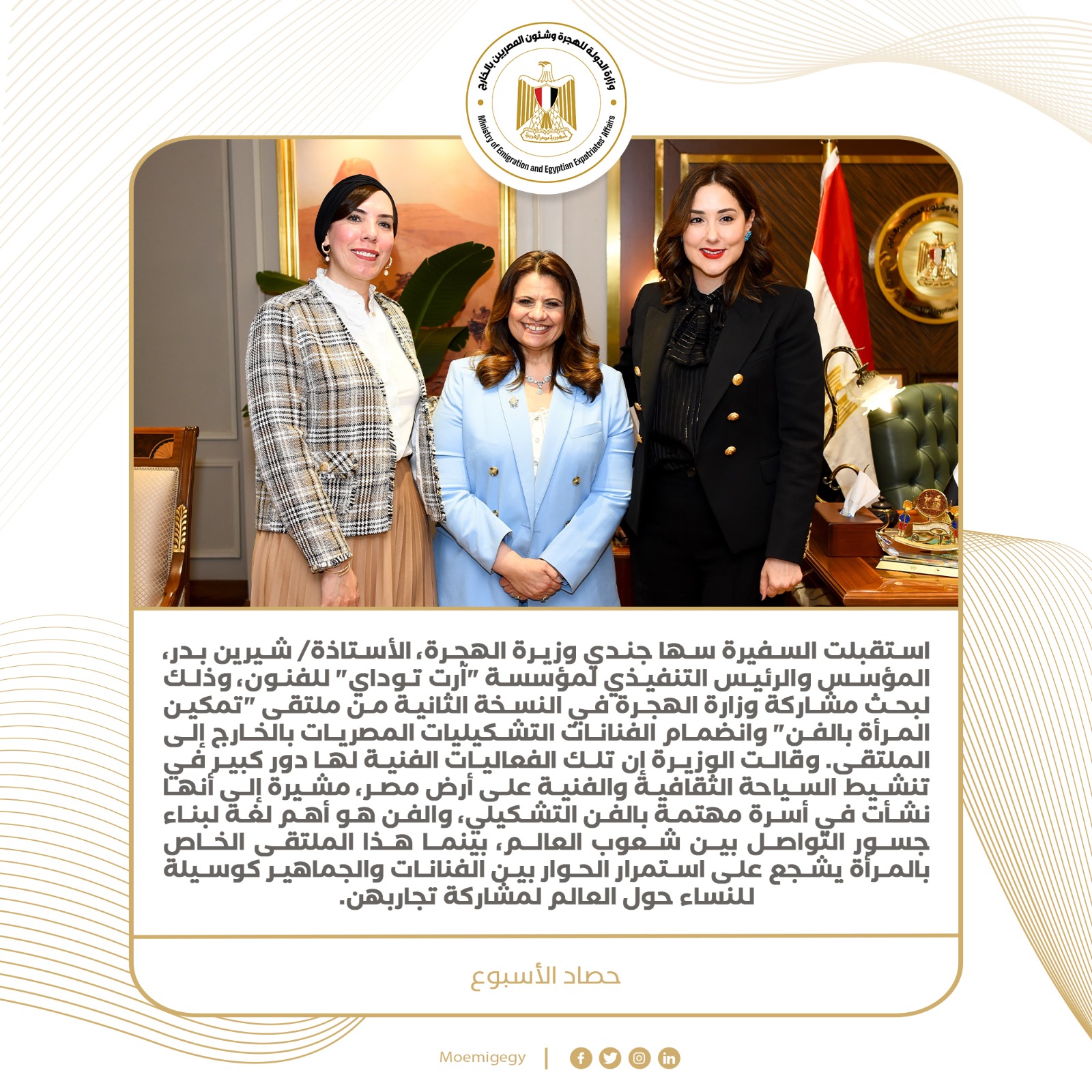 4- استقبلت السفيرة سها جندي وزيرة الهجرة، الأستاذة/ شيرين بدر، المؤسس والرئيس التنفيذي لمؤسسة "آرت توداي" للفنون، وذلك لبحث مشاركة وزارة الهجرة في النسخة الثانية من ملتقى "تمكين المرأة بالفن" وانضمام الفنانات التشكيليات المصريات بالخارج إلى الملتقى. وقالت الوزيرة إن تلك الفعاليات الفنية لها دور كبير في تنشيط السياحة الثقافية والفنية على أرض مصر، مشيرة إلى أنها نشأت في أسرة مهتمة بالفن التشكيلي، والفن هو أهم لغة لبناء جسور التواصل بين شعوب العالم، بينما هذا الملتقى الخاص بالمرأة يشجع على استمرار الحوار بين الفنانات والجماهير كوسيلة للنساء حول العالم لمشاركة تجاربهن.