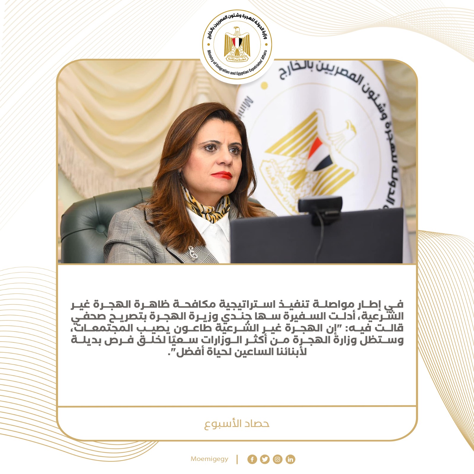 5- في إطار مواصلة تنفيذ استراتيجية مكافحة ظاهرة الهجرة غير الشرعية، أدلت السفيرة سها جندي وزيرة الهجرة بتصريح صحفي قالت فيه: "إن الهجرة غير الشرعية طاعون يصيب المجتمعات، وستظل وزارة الهجرة من أكثر الوزارات سعيًا لخلق فرص بديلة لأبنائنا الساعين لحياة أفضل".