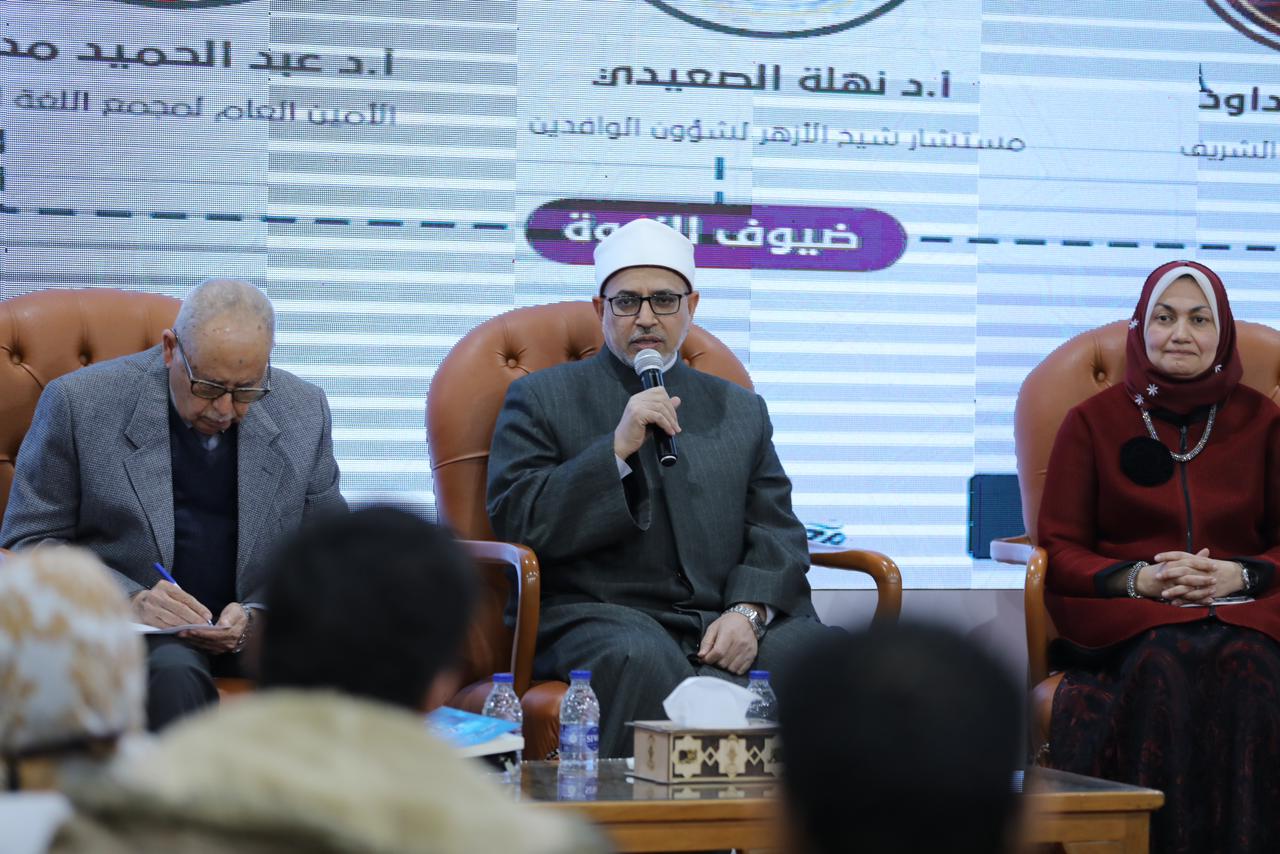 من جانبه أوضح الدكتور سلامة داود، رئيس جامعة الأزهر، أن اللغة العربية هي أوسع اللغات مذهبًا من حيث المفردات والتراكيب، وأن الأزهر معني بالحفاظ عليها ونشرها وتعليمها للناس، مشيرًا إلى أن جامعة الأزهر تسعى لتطبيق "تعريب العلوم" في الطب والصيدلة والهندسة وعلوم الحاسب لتدرس باللغة العربية التي فيها الأصالة والكلمات القيمة التي تُحيي فكر الأمة، وتعقد الجامعة دورات تدريبية للخطباء والأئمة في التحدث باللغة العربية، فضلًا عن الدورات التي تعقد لرفع مهارات أعضاء هيئة التدريس بالجامعة في مختلف الكليات لإتقان اللغة العربية تحدثًا وكتابةً، مبينًا أن للأسرة دور كبير في الحفاظ عليها وإتقانها، وهناك خطأ كبير تقع فيه بعض الأسر حينما ترغم الأطفال على تعلم اللغات الأجنبية، على عكس ما تربينا عليه في الأزهر من حفظ القرآن الكريم، وإتقان لغته، والاعتزاز بتعلم العربية، وإظهار التميز فيها في مختلف المحافل العلمية والأكاديمية.