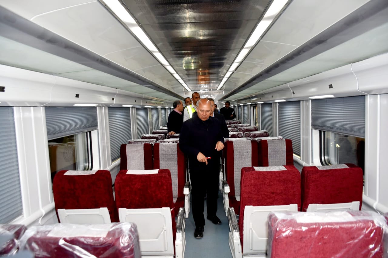 بدأت الجولة بتفقد الوزير لأحد القطارات الاسباني الجاري اعادة تأهيلها وتطويرها وتحديثها بالكامل حيث يتم تغيير وتجديد كافة دواخل العربة من مقاعد وارضيات وشبابيك وستائر وتكييف بالإضافة إلى دهان العربة من الخارج بشكل مميز، حيث شاهد الوزير عربات من الدرجة الأولى والثانية التي تم الانتهاء منها وذلك في اطار مشروع رفع كفاءة عدد 150 عربة اسباني مكيفة و حيث يتكون كل قطار أسباني مكيف من 11 عربة بواقع عدد ( 4) عربة درجة أولى – عدد ( 6) عربات درجة ثانية – عدد 1 عربة بوفية ودرجة ثانية وحيث تم الإنتهاء من ٤ قطارات بإجمالي (44 عربة) منهم وتم دخولهم الخدمة وجاري الإنتهاء من القطار الخامس على ان يتم ادخال باقي القطارات تباعا بعد اعادة تأهيلها وتطويرها وتحديثها بالكامل لتقديم أعلى مستويات الخدمة لجمهور الركاب