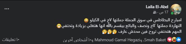 وعلق أحد المستخدمين للتطبيق قائلاً :امبارح البطاطس في سوق الجملة جملتها 7 ج في الكيلو النهاردة جملتها 12 ج ونصف والبائع بيقسم بالله انها هتغلي بزيادة وتختفي ،المهم هتختفي تروح فين محدش عارف .