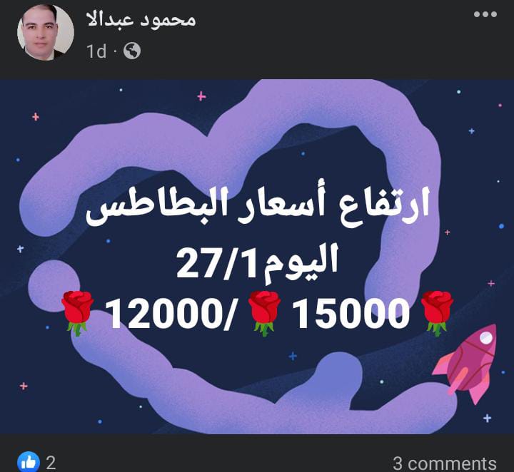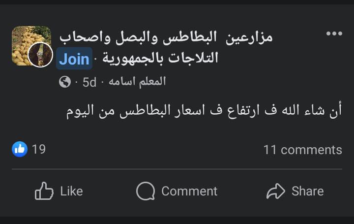 بينما نشر حساب أخر علي إحدي المجموعات تدعي بـ “مزارعين البطاطس والبصل واصحاب الثلاجات بالجمهورية “ قائلا: إن شاء الله في ارتفاع في البطاطس اليوم