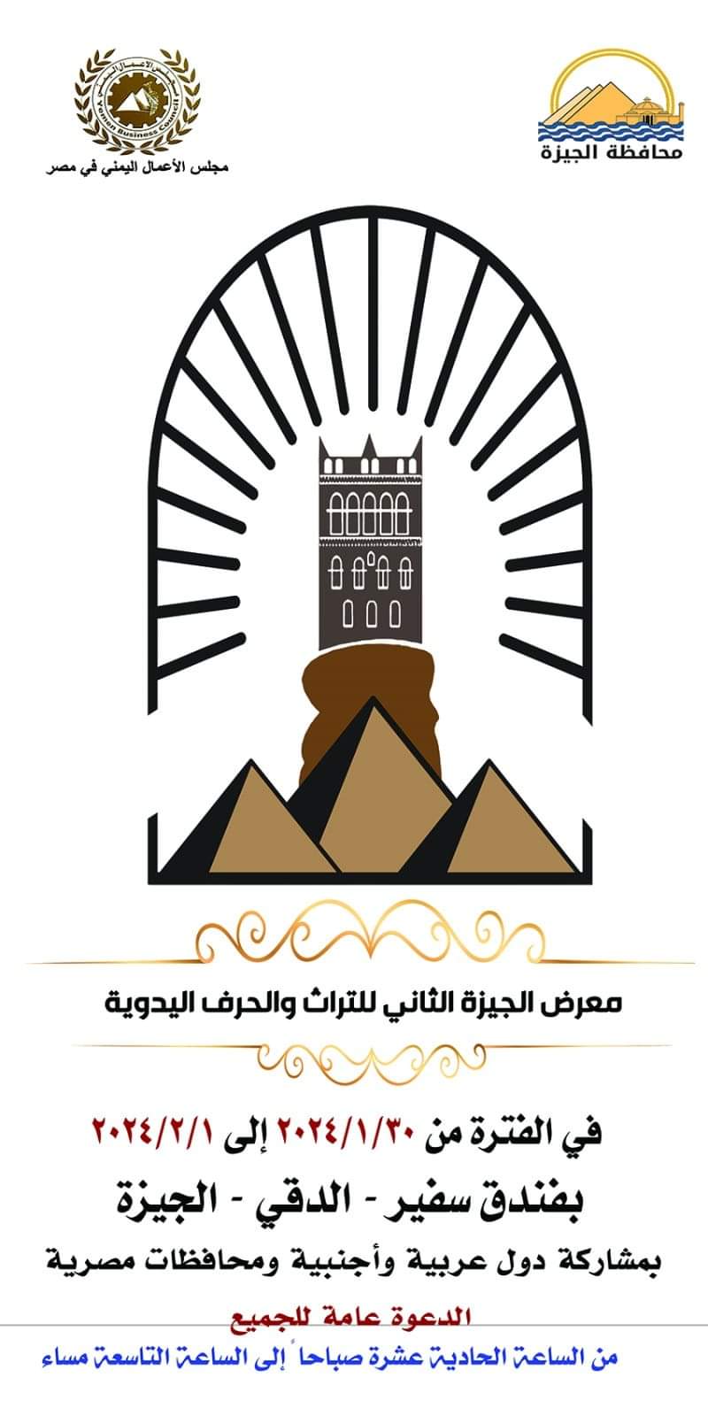 تنظم محافظة الجيزة بالتعاون مع مجلس الأعمال اليمني معرضا للحرف التراثية والمنتجات اليدوية والذي يشمل منتجات السجاد والخزف والفخار وغيرها من المنتجات والحرف اليدوية التي تشتهر بها العديد من القري بمحافظة الجيزة وذلك بفندق سفير بالدقي .