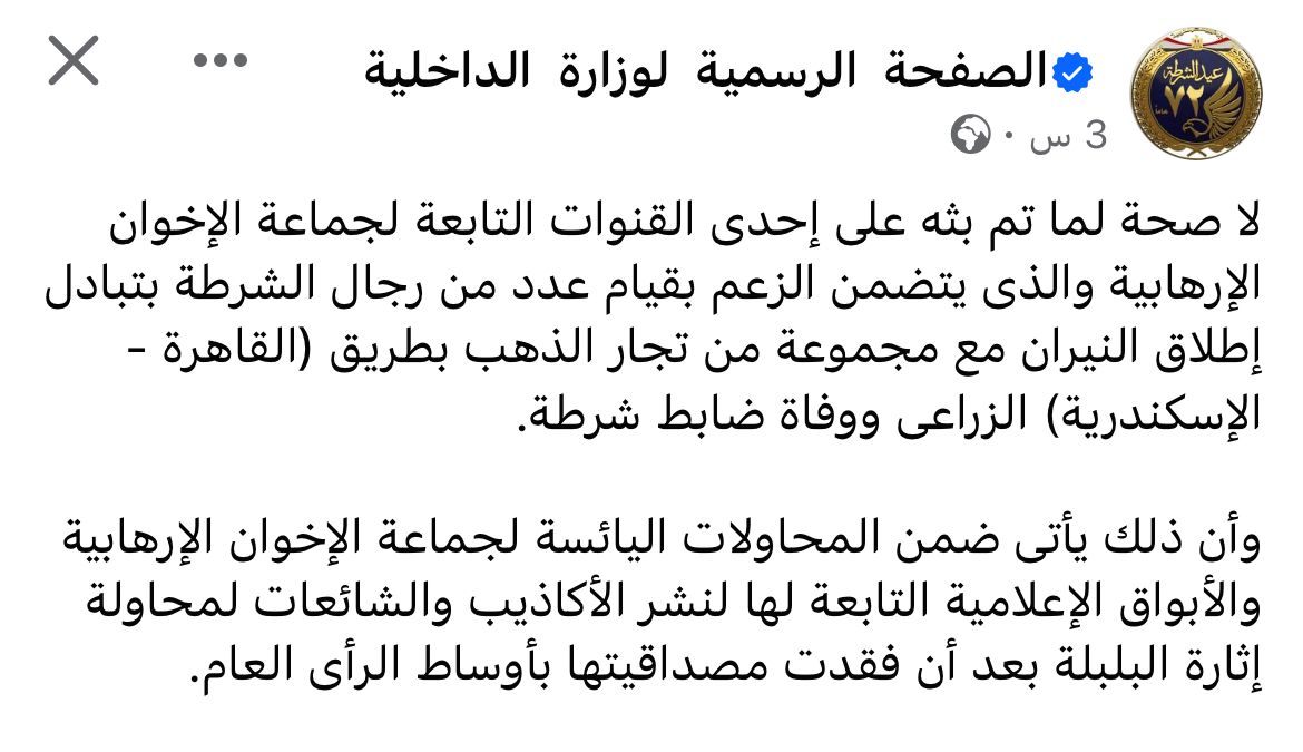 وأكدت وزارة الداخلية على أنه لا صحة لما تم بثه على إحدى القنوات التابعة لجماعة الإخوان الإرهابية والذى يتضمن الزعم بقيام عدد من رجال الشرطة بتبادل إطلاق النيران مع مجموعة من تجار الذهب بطريق (القاهرة - الإسكندرية) الزراعى ووفاة ضابط شرطة.