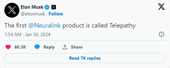 وقال ماسك في منشور منفصل عبر "إكس"، إن شريحة Neuralink سيُطلق عليها اسم "تيليباثي" (Telepathy).