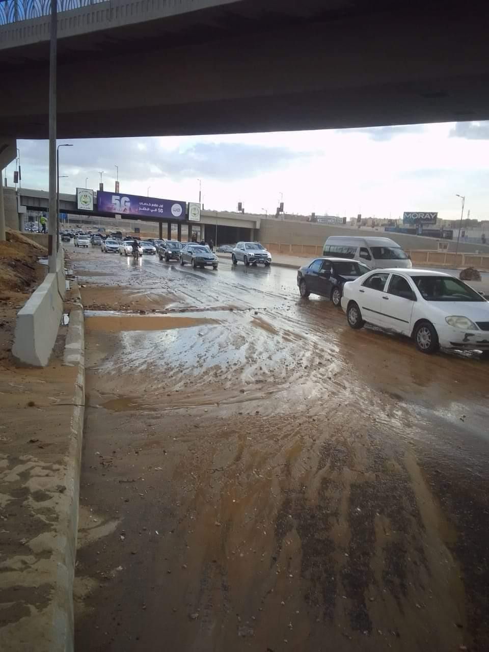 كسر ماسورة مياه أسفل كوبري المشير مع محور محمد زكي وتعطيل حركة المرور