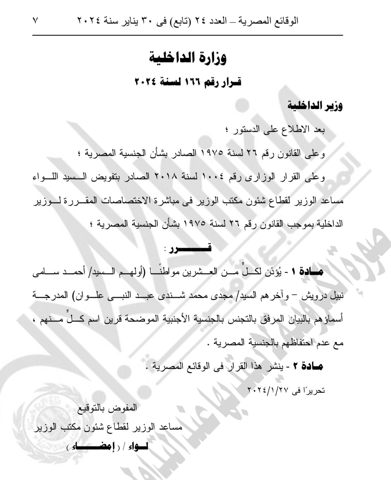 كما أذن وزير الداخلية بالموافقة على تجنس عدد من الأشخاص بالجنسية الأجنبية مع احتفاظهم بالجنسية المصرية.
