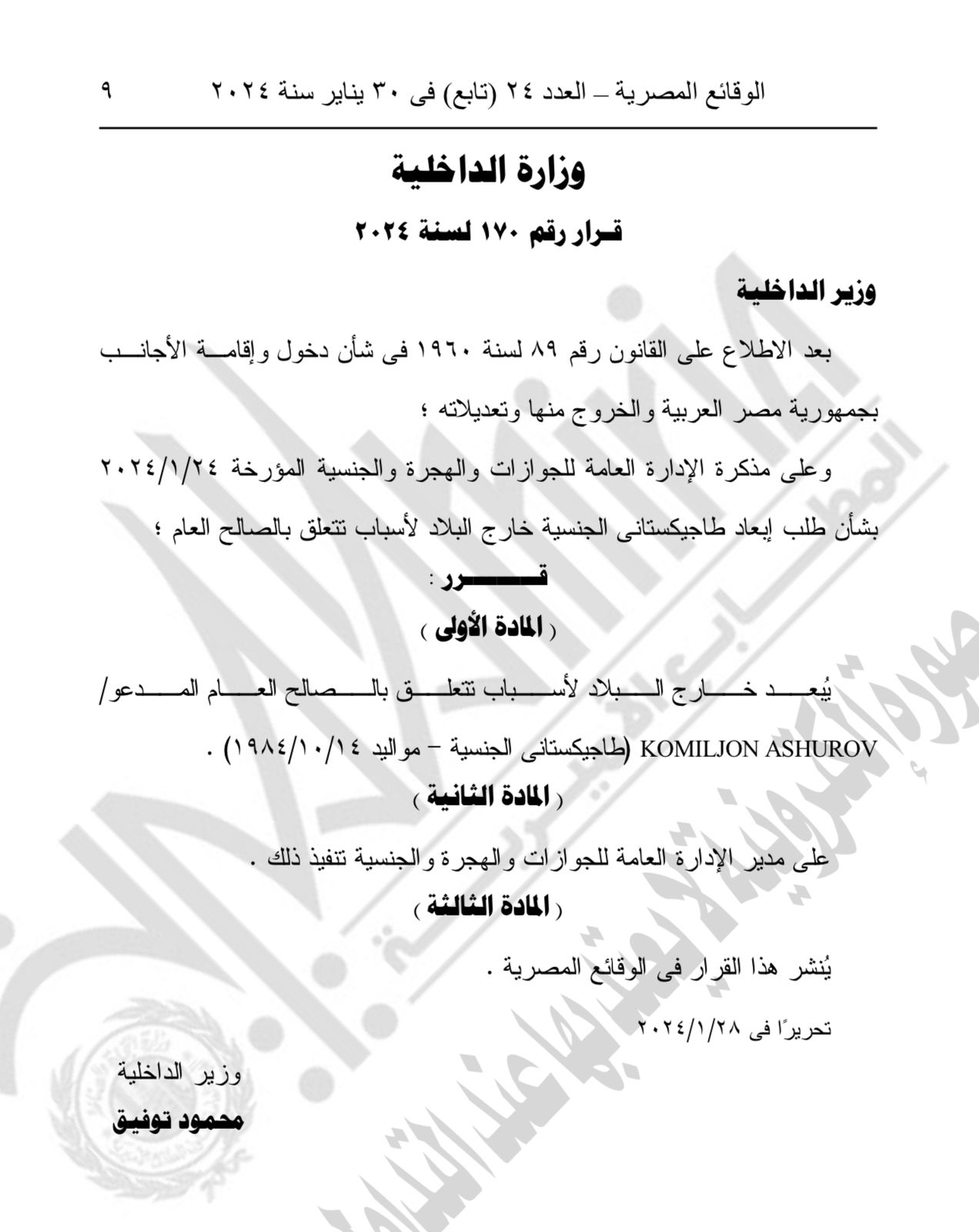 أصدرت وزارة الداخلية قرار بإبعاد طاجيكستاني الجنسية خارج البلاد لأسباب تتعلق بالصالح العام.
