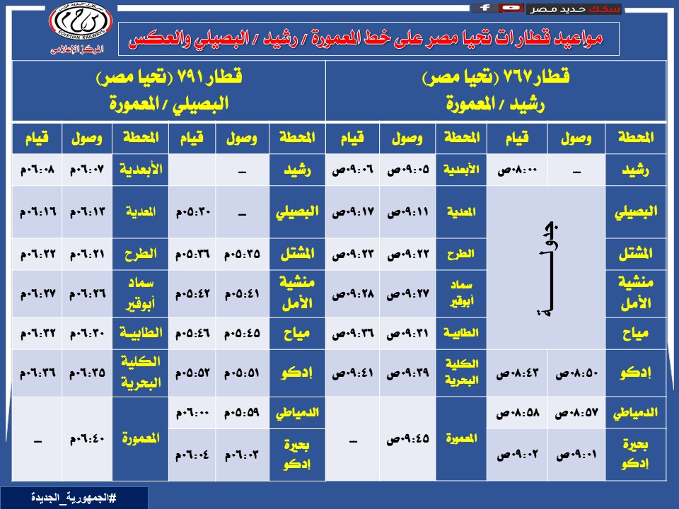 أعلنت الهيئة القومية لسكك حديد مصر، أنه وفقا للجداول المعلنه سابقا فسيتم إيقاف حركة القطارات بين محطتي أبوقير / المنتزه بخط (الأسكندرية / أبو قير) اعتباراً من صباح الخميس الموافق 1/2/2024 لنهو الأعمال التنفيذية بالمرحلة الثانية من المشروع على ان يتم تشغيل القطارات فى المسافة ما بين محطتى سيدى جابر / المنتزه طبقا للجدول المرفق وانتهاء كافة قطارات خط رشيد بمحطة المعمورة طبقا لجداولهم الصادرة فى يناير 2023 ، ويذكر انة قد سبق ايقاف تشغيل القطارات فى المسافة بين محطة الاسكندرية ومحطة سيدى جابر كمرحلة أولى.