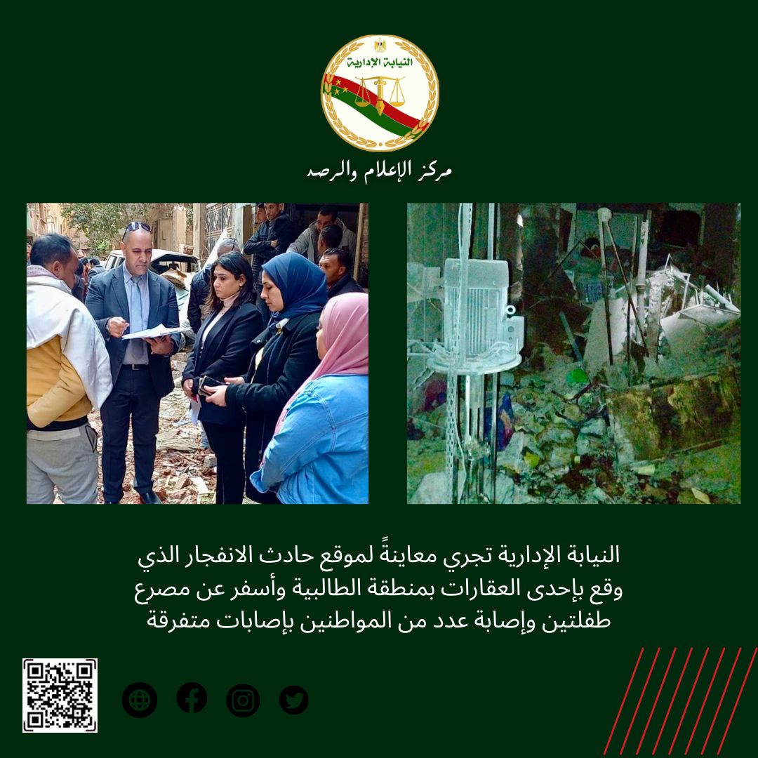 أجرت النيابة الإدارية بالجيزة القسم الأول، اليوم الأربعاء، معاينةً لموقع العقار الكائن بشارع "المَنحَل" بمنطقة الطالبية بمحافظة الجيزة، والذى شهد انفجارا فى الجراج الخاص بالعقار بسبب استخدامه كمصنع لإنتاج الصابون ووجود اسطوانات كيمياوية تسببت إحداها بالانفجار في ساعة مبكرة من صباح اليوم؛ ما أسفر عن إصابة 15 شخصا بإصابات متفرقة.