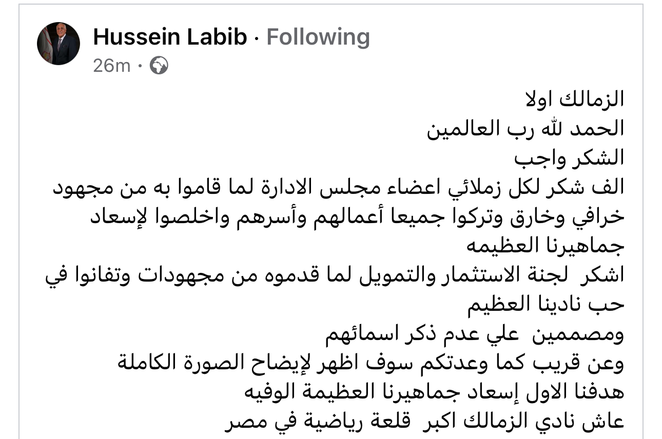 وقال حسين لبيب،"الزمالك اولا الحمد لله رب العالمين الشكر واجب الف شكر لكل زملائي اعضاء مجلس الادارة لما قاموا به من مجهود خرافي وخارق وتركوا جميعا أعمالهم وأسرهم واخلصوا لإسعاد جماهيرنا العظيمه , اشكر لجنة الاستثمار والتمويل لما قدموه من مجهودات وتفانوا في حب نادينا العظيم ومصممين علي عدم ذكر اسمائهم وعن قريب كما وعدتكم سوف اظهر لإيضاح الصورة الكاملة".