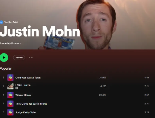 وعلى حساب "Spotify" كان لديه العديد من الأغاني التي أنتجها وأداها، بما في ذلك "لقد جاءوا من أجل جاستن موهن" و"I Miss Lauren" و"Judge Kathy Toilet".