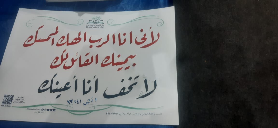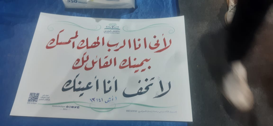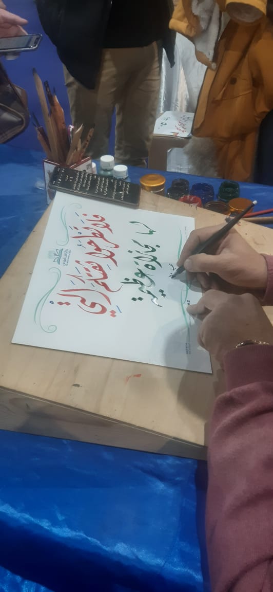 خطاط بقاعة 2 يكتب آيات الكتاب المقدس ويقدمها هدية لزوار المعرض