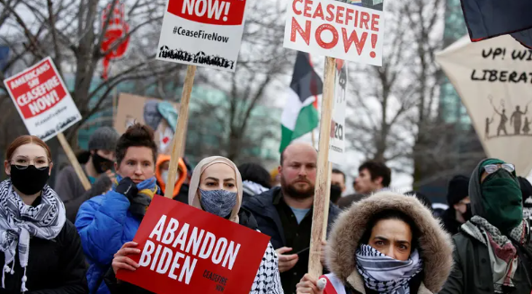 ويحتج العرب والفلسطينيون والمسلمون في الولايات المتحدة، بالإضافة إلى ناشطين مناهضين للحرب، على السياسة الأميركية في الصراع في غزة حيث قتلت الهجمات الإسرائيلية نحو 27 ألفا، أي أكثر من واحد بالمئة من سكان القطاع البالغ عددهم 2.3 مليون نسمة، بحسب وزارة الصحة هناك.