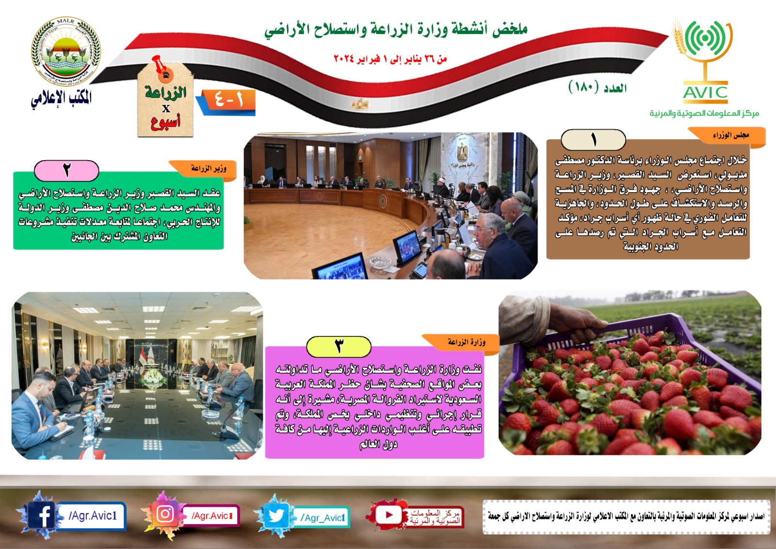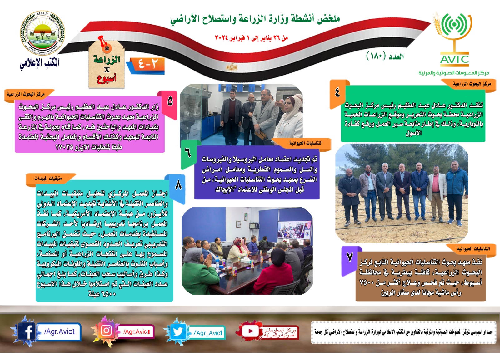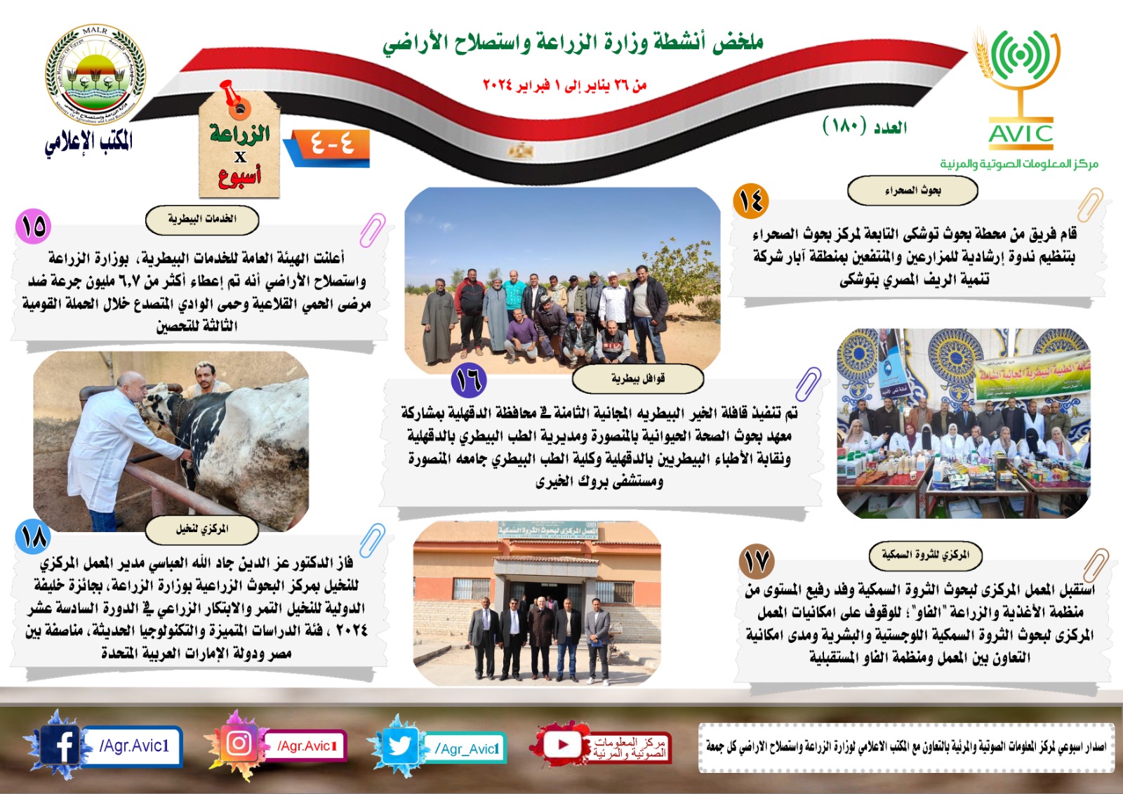 أصدر مركز المعلومات الصوتية والمرئية، التابع لوزارة الزراعة واستصلاح الاراضي، "الانفوجراف الاسبوعي" في نسخته رقم 179 ، حول الحصاد الاسبوعي لأهم أنشطة الوزارة، خلال الاسبوع الماضي في الفترة من 26 يناير وحتى 1 فبراير الجاري، وذلك بالتعاون مع المكتب الاعلامي للوزارة، كما أصدر المركز ايضا ملخصا بالفيديو، حول انشطة الوزارة خلال نفس الفترة.