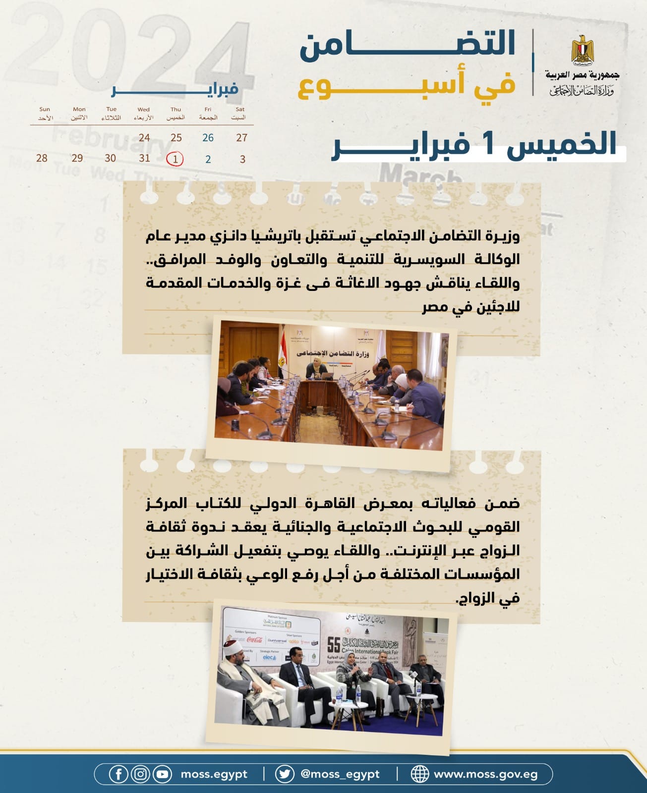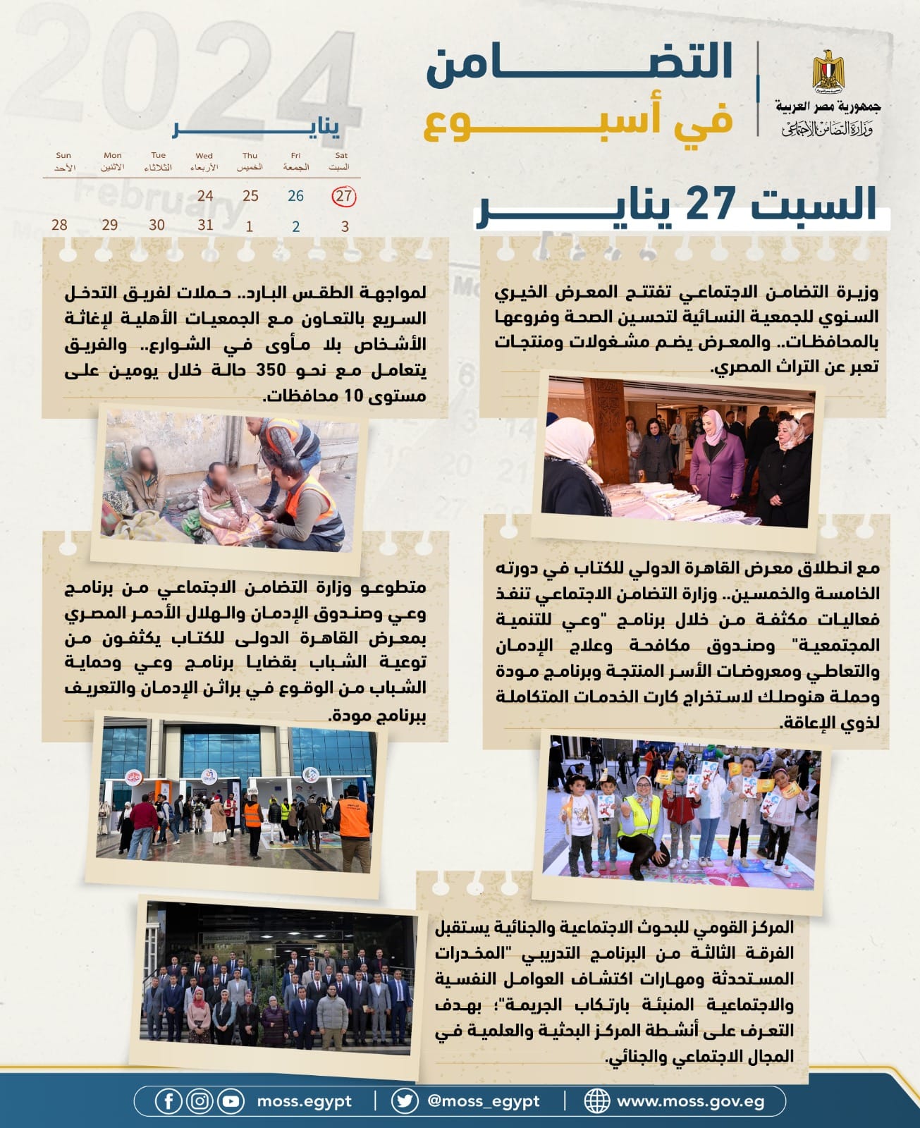 - مع انطلاق معرض القاهرة الدولي للكتاب في دورته الخامسة والخمسين.. وزارة التضامن الاجتماعي تنفذ فعاليات مكثفة من خلال برنامج "وعي للتنمية المجتمعية" وصندوق مكافحة وعلاج الإدمان والتعاطي ومعروضات الأسر المنتجة وبرنامج مودة وحملة هنوصلك لاستخراج كارت الخدمات المتكاملة لذوي الإعاقة.