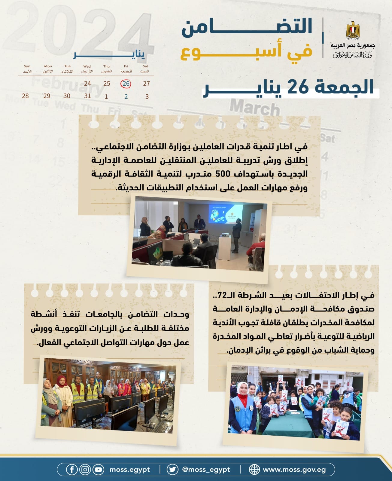 - في اطار تنمية قدرات العاملين بوزارة التضامن الاجتماعي.. إطلاق ورش تدريبة للعاملين المنتقلين للعاصمة الإدارية الجديدة باستهداف 500 متدرب لتنمية الثقافة الرقمية ورفع مهارات العمل على استخدام التطبيقات الحديثة.