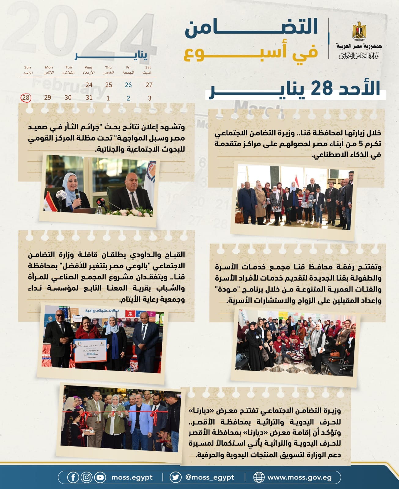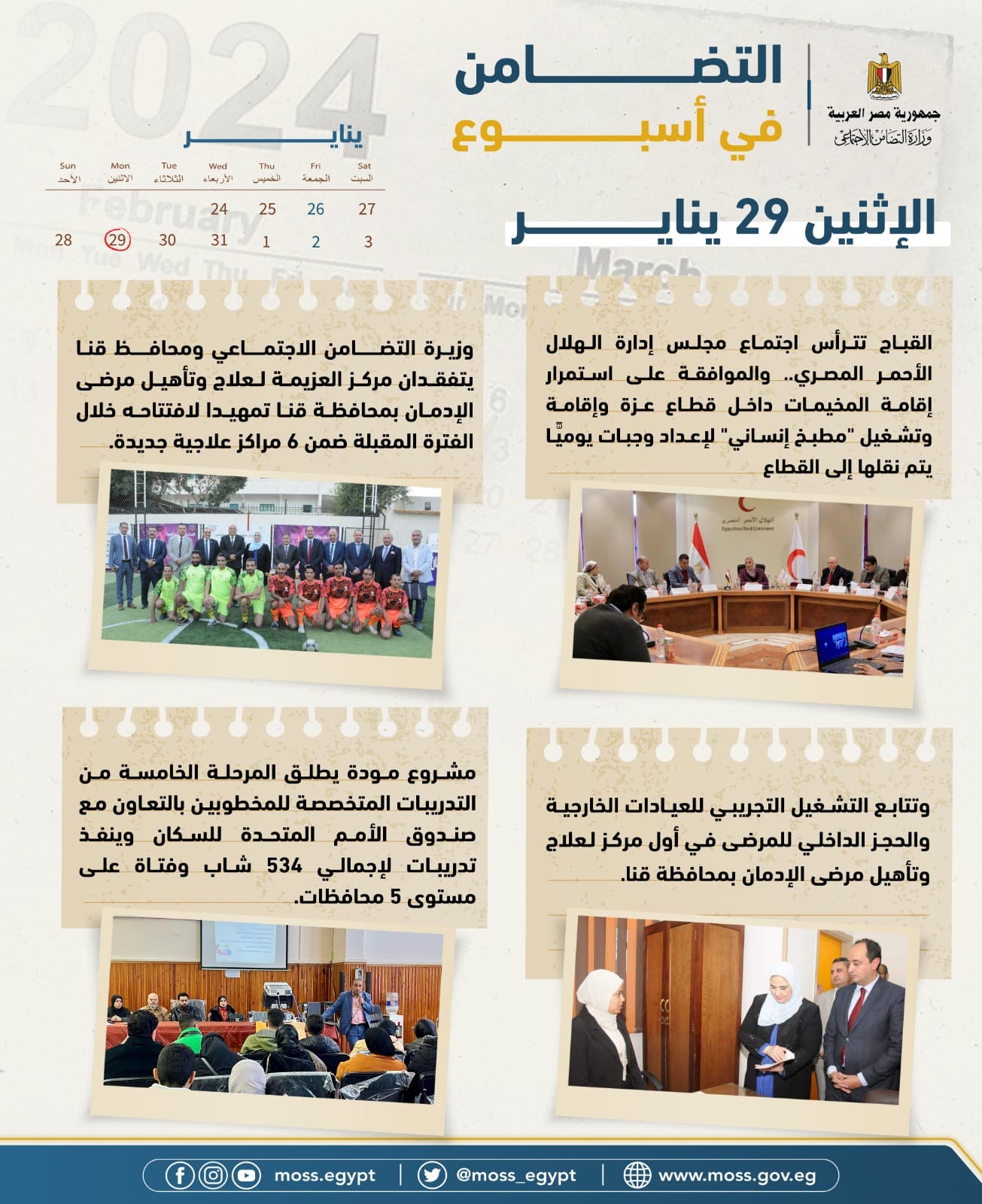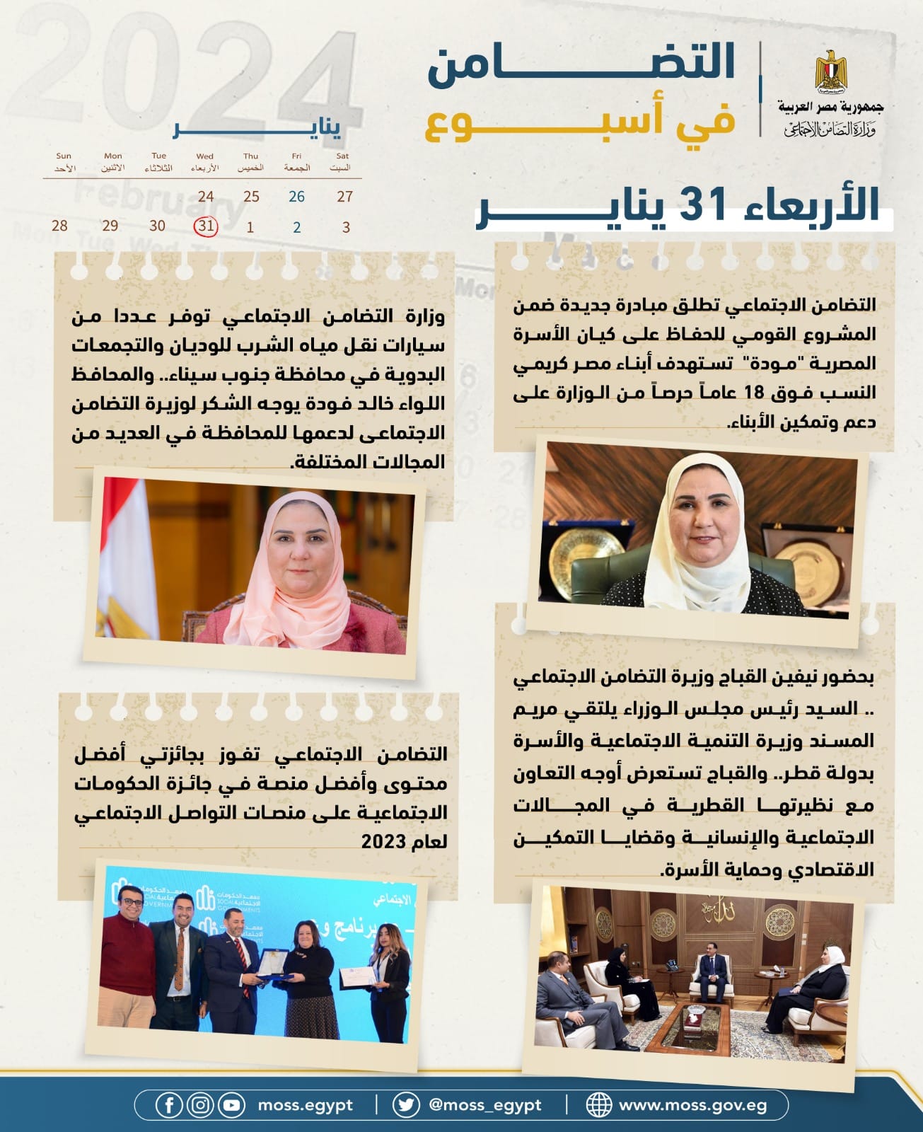 أصدرت وزارة التضامن الاجتماعي تقريرها الأسبوعي بالإنفوجراف ، حيث تستعرض من خلاله الأنشطة والأحداث، التي قامت بها نيفين القباج وزيرة التضامن الاجتماعي، وكذلك قطاعات الوزارة المختلفة خلال الفترة من 26 يناير إلى 1 فبراير 2024 ونستعرض أبرزها في التقرير التالي: