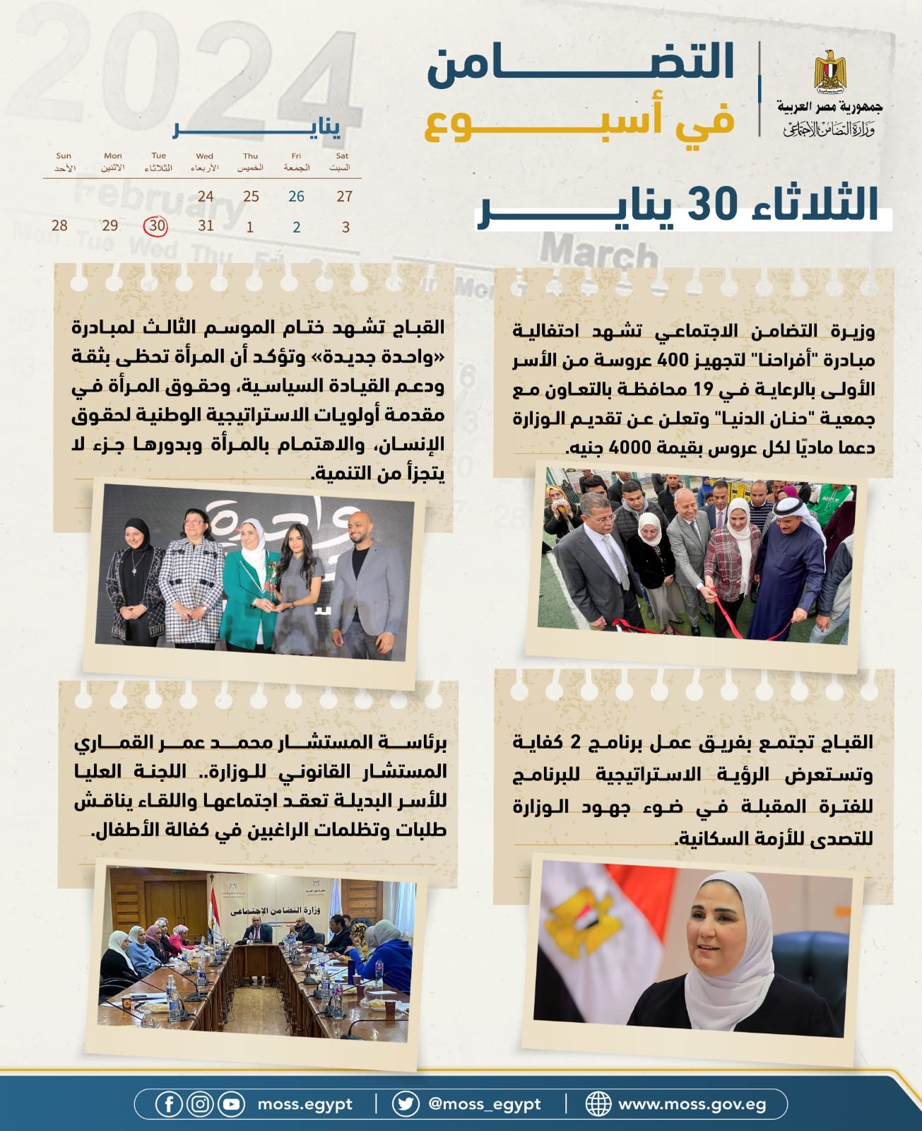 - وزيرة التضامن الاجتماعي تشهد احتفالية مبادرة "أفراحنا" لتجهيز 400 عروسة من الأسر الأولى بالرعاية في 19 محافظة بالتعاون مع جمعية "حنان الدنيا" وتعلن عن تقديم الوزارة دعما ماديًا لكل عروس بقيمة 4000 جنيه.