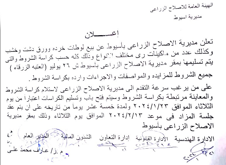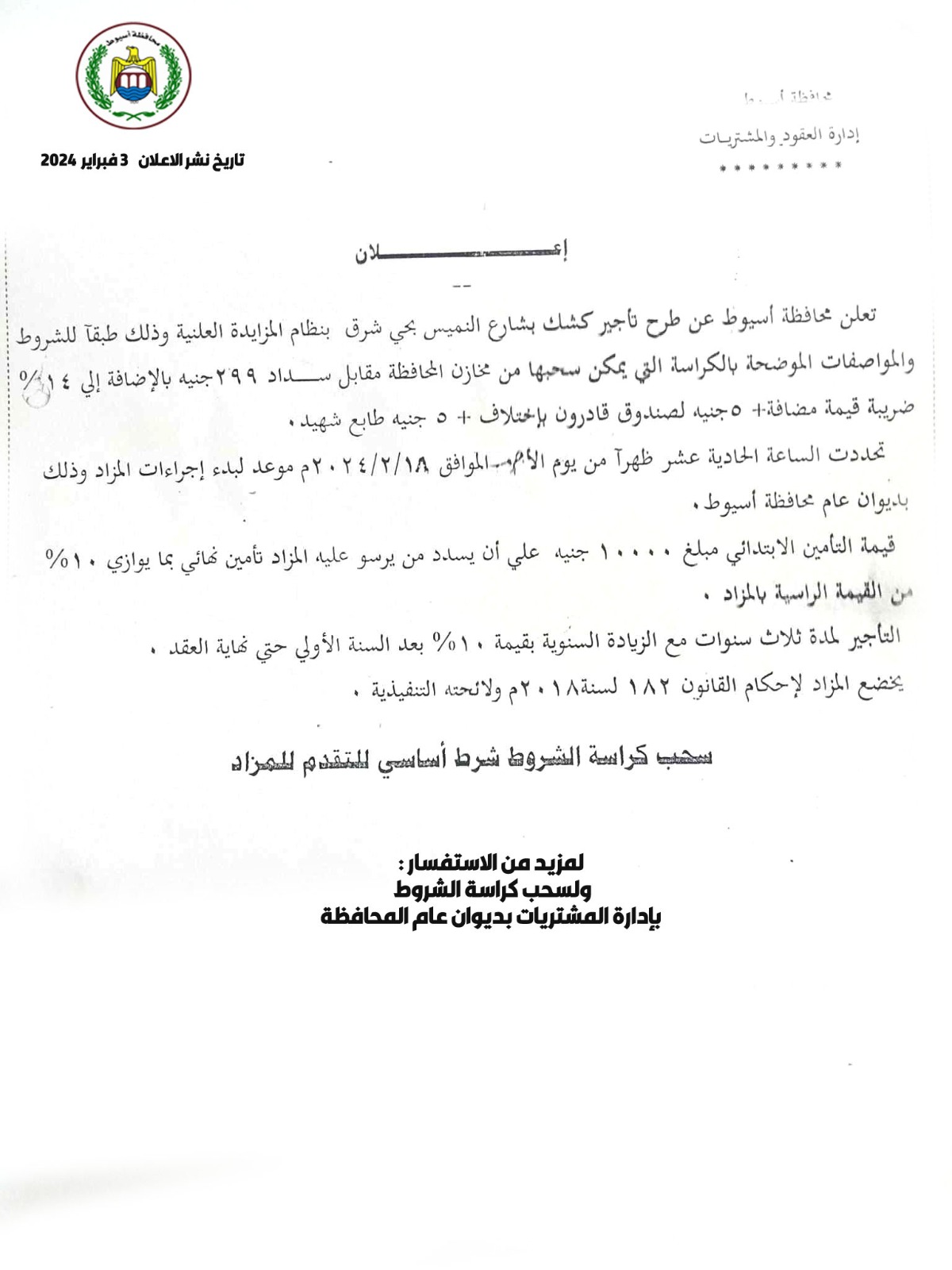 محافظة أسيوط تعلن عن مزادات ومناقصات شهر فبراير 2024
