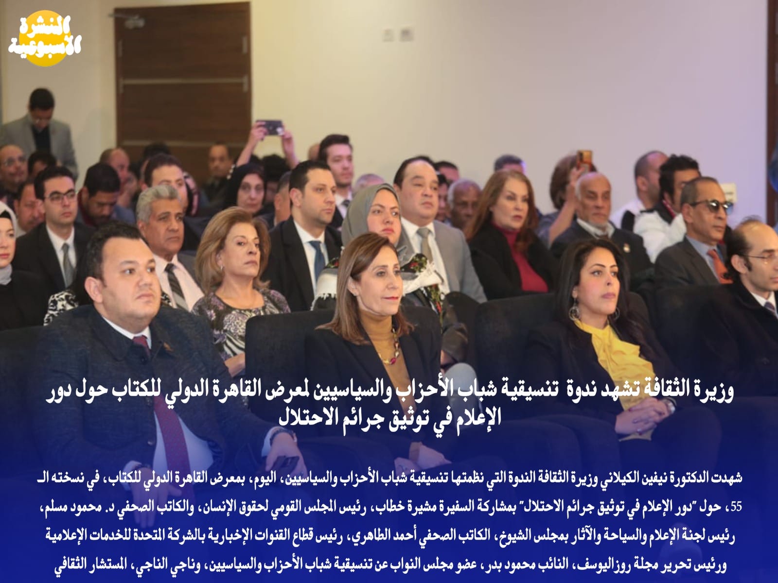 وزيرة الثقافة تشهد ندوة تنسيقية شباب الأحزاب والسياسيين لمعرض القاهرة الدولي للكتاب حول دور الإعلام في توثيق جرائم الاحتلال