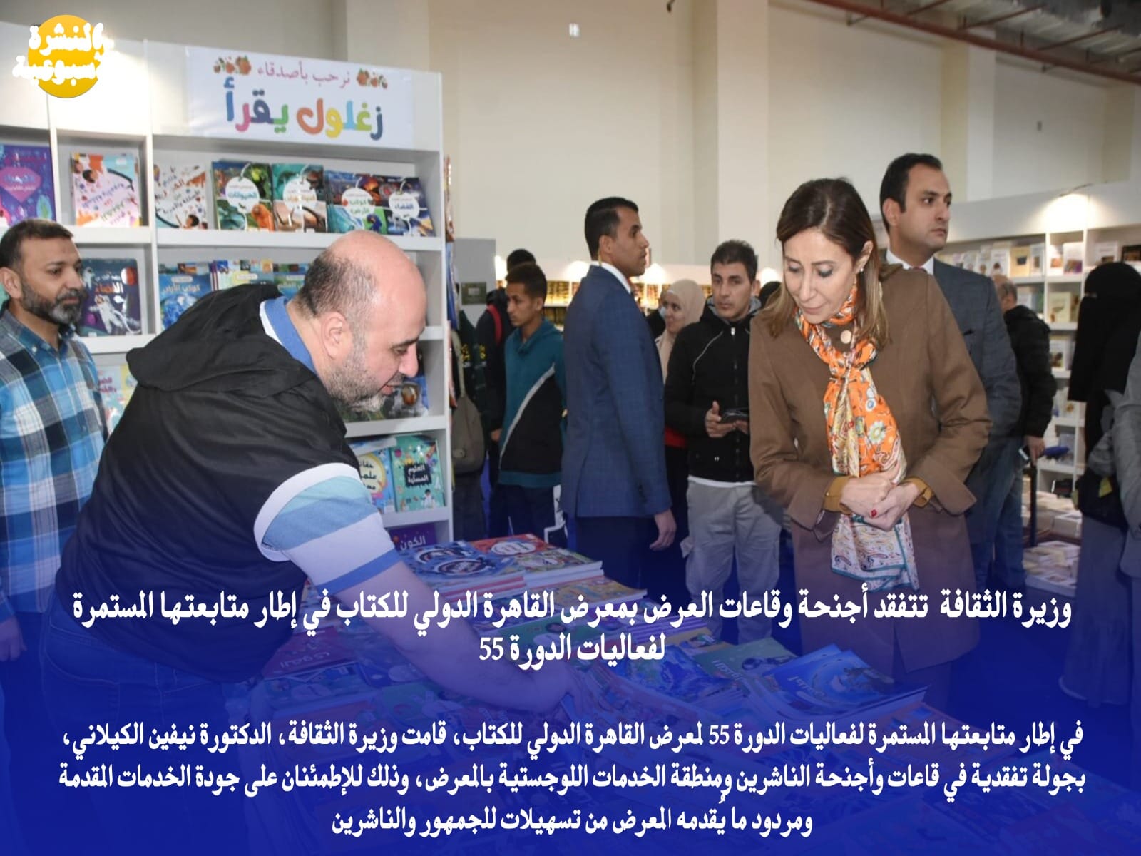 في إطار متابعتها المستمرة لفعاليات الدورة 55 لمعرض القاهرة الدولي للكتاب، قامت وزيرة الثقافة، الدكتورة نيفين الكيلاني، بجولة تفقدية في قاعات وأجنحة الناشرين ومنطقة الخدمات اللوجستية بالمعرض، وذلك للاطمئنان على جودة الخدمات المقدمة ومردود ما يُقدمه المعرض من تسهيلات للجمهور والناشرين.