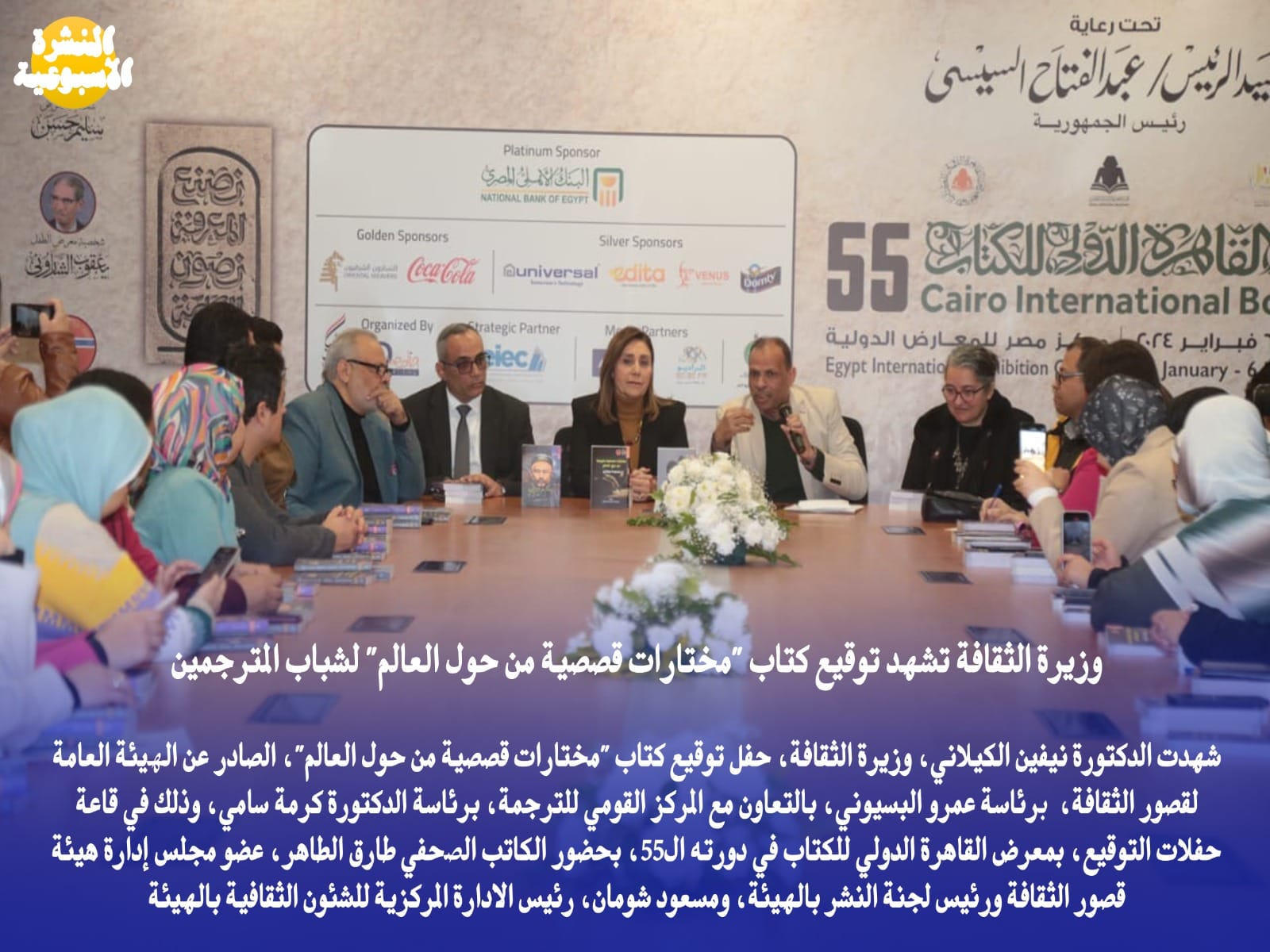 شهدت الدكتورة نيفين الكيلاني، وزيرة الثقافة، حفل توقيع كتاب "مختارات قصصية من حول العالم"، الصادر عن الهيئة العامة لقصور الثقافة، برئاسة عمرو البسيوني، بالتعاون مع المركز القومي للترجمة، برئاسة الدكتورة كرمة سامي، وذلك في قاعة حفلات التوقيع، بمعرض القاهرة الدولي للكتاب في دورته ال55، بحضور الكاتب الصحفي طارق الطاهر، عضو مجلس إدارة هيئة قصور الثقافة ورئيس لجنة النشر بالهيئة، ومسعود شومان، رئيس الادارة المركزية للشئون الثقافية بالهيئة.