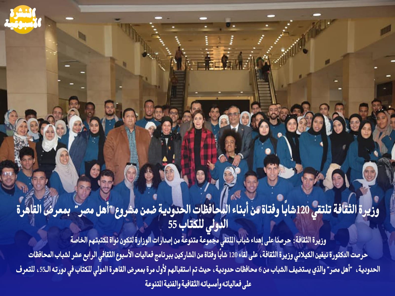 حرصت الدكتورة نيفين الكيلاني وزيرة الثقافة، على لقاء 120 شابًا وفتاة من المشاركين ببرنامج فعاليات الأسبوع الثقافي الرابع عشر لشباب المحافظات الحدودية، "أهل مصر" والذي يستضيف الشباب من 6 محافظات حدودية، حيث تم استقبالهم لأول مرة بمعرض القاهرة الدولي للكتاب في دورته الـ55، للتعرف على فعالياته وأمسياته الثقافية والفنية المتنوعة.