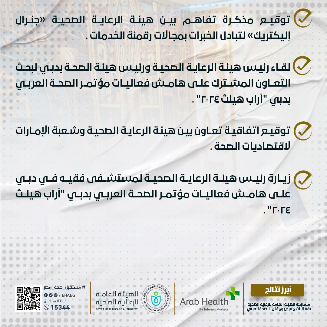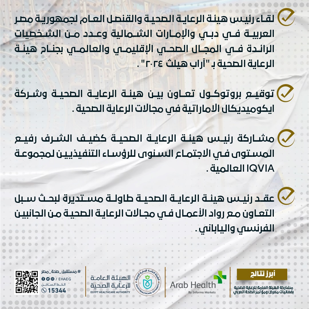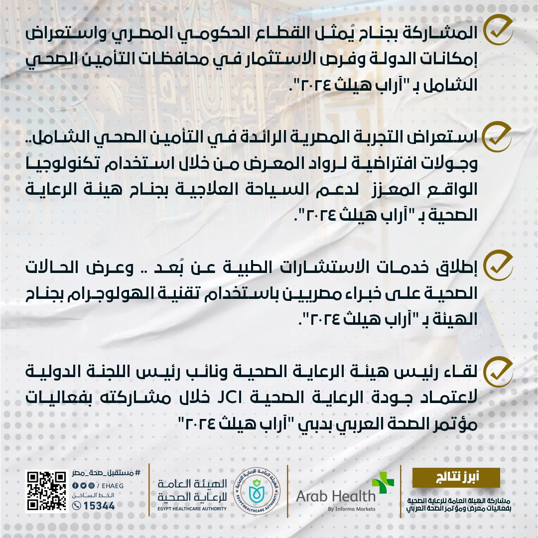 و أبرز الانفوجراف،استعراض الهيئة للتجربة المصرية الرائدة في التغطية الصحية الشاملة، واستخدام تكنولوجيا الواقع المعزز لإجراء جولات افتراضية لدعم السياحة العلاجية لرواد جناح الهيئة المشارك بمعرض ومؤتمر الصحة العربي بدبي "آراب هيلث 2024"، فضلًا عن إطلاق خدمات الاستشارات الطبية عن بُعد، وعرض الحالات الصحية على خبراء مصريين باستخدام تقنية الهولوجرام داخل الجناح الخاص بالهيئة والمشارك بالمعرض.