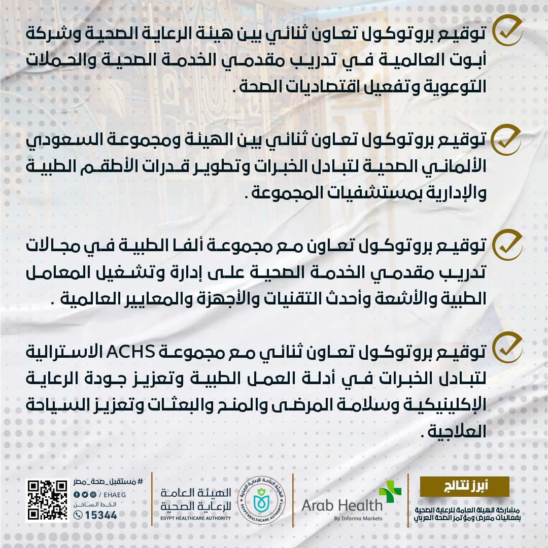 وتابع الانفوجراف: تم توقيع بروتوكول تعاون مع مجموعة السعودي الألماني الصحية لتبادل الخبرات وتطوير قدرات الأطقم الطبية والإدارية بمستشفيات المجموعة، وآخر مع مجموعة ألفا الطبية في مجالات تدريب مقدمي الخدمة الصحية على إدارة وتشغيل المعامل الطبية والأشعة وأحدثةالتقنيات والأجهزة والمعايير العالمية، وبروتوكول تعاون ثنائي مع مجموعة ACHS الاسترالية لتبادل الخبرات في أدلة العمل الطبية وتعزيز جودة الرعاية الإكلينيكية وسلامة المرضى والمنح والبعثات وتعزيز السياحة العلاجية، وذلك خلال فعاليات معرض ومؤتمر الصحة العربي بدبي "آراب هيلث 2024" خلال الفترة (29 يناير - 1 فبراير 2024)