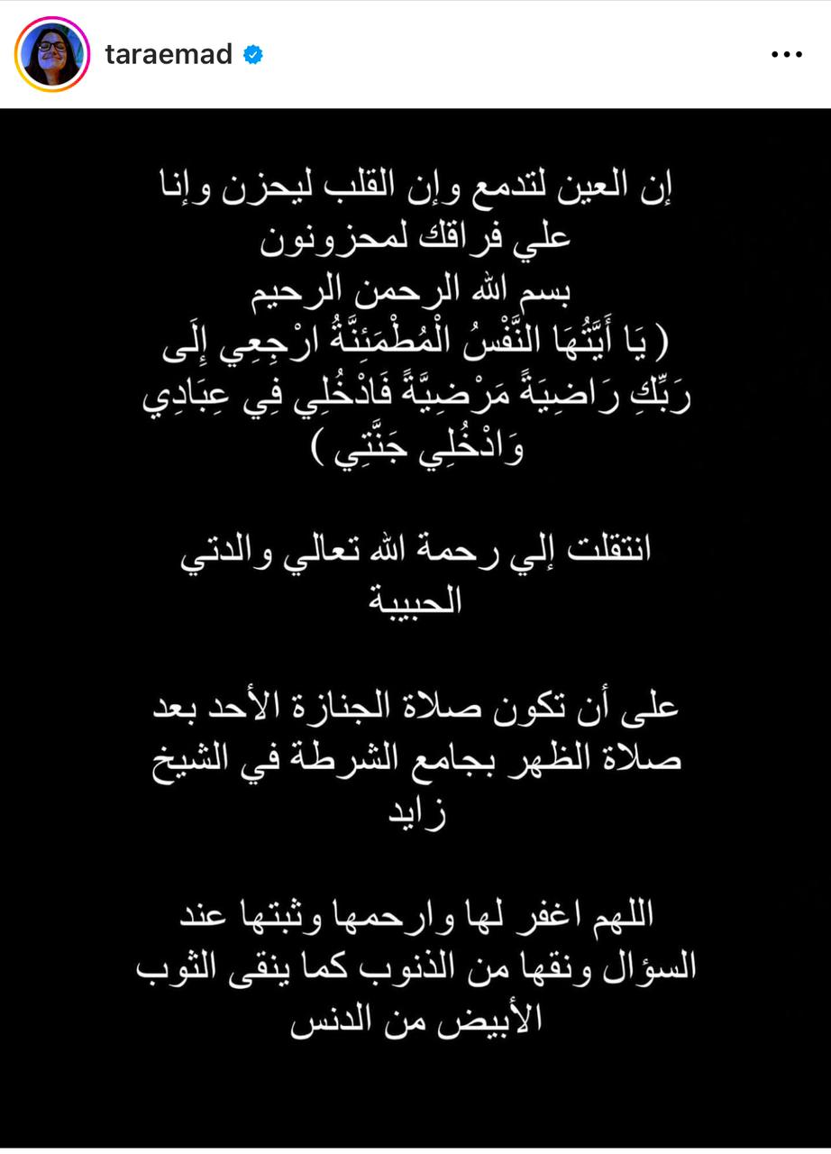 أعلنت الفنانة تارا عماد عن وفاة والدتها عبر خاصة الأستورى على موقع تبادل الصور والفيديوهات إنستجرام، حيث كتبت: انتقلت والدتى الحبيبة، وصلاة الجنازة غدًا الأحد بمسجد الشرطة بالشيخ زايد.