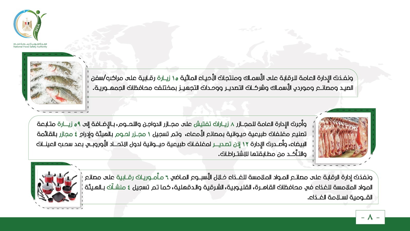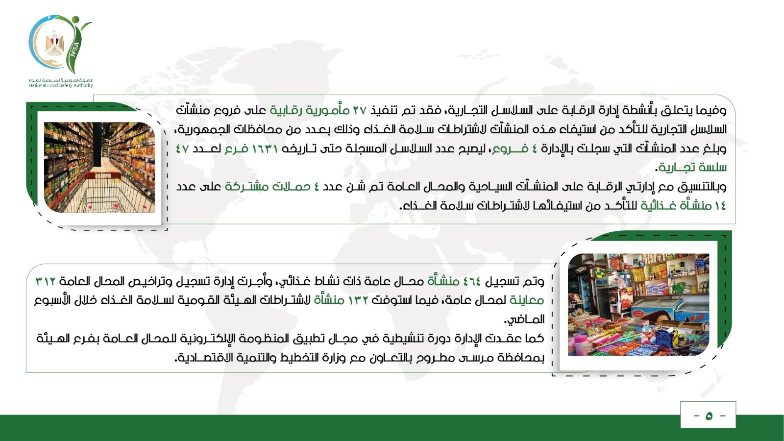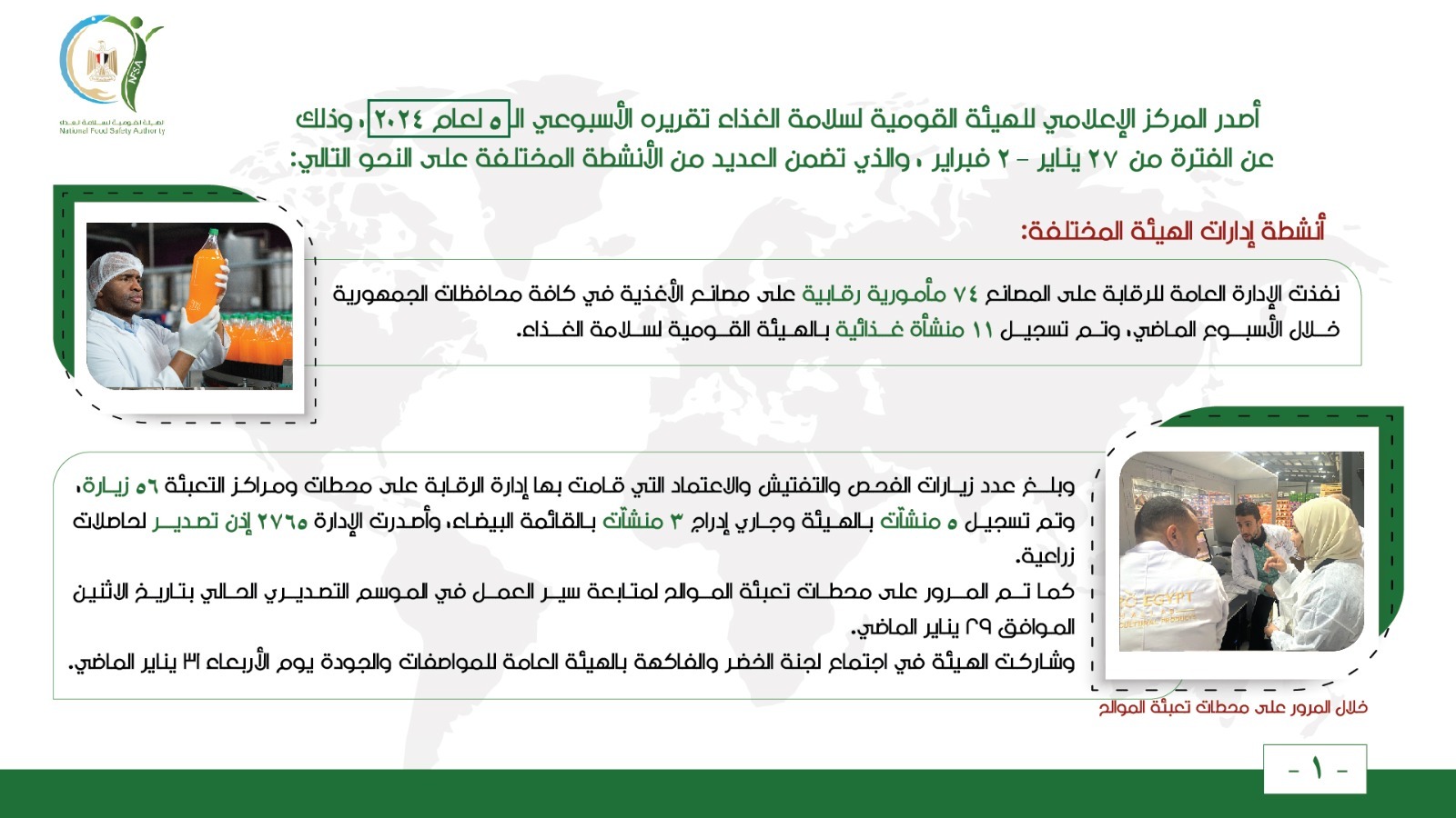 بالإنفوجراف.. المركز الإعلامي للهيئة القومية لسلامة الغذاء يصدر تقريره الأسبوعي الــ 5 لعام 2024