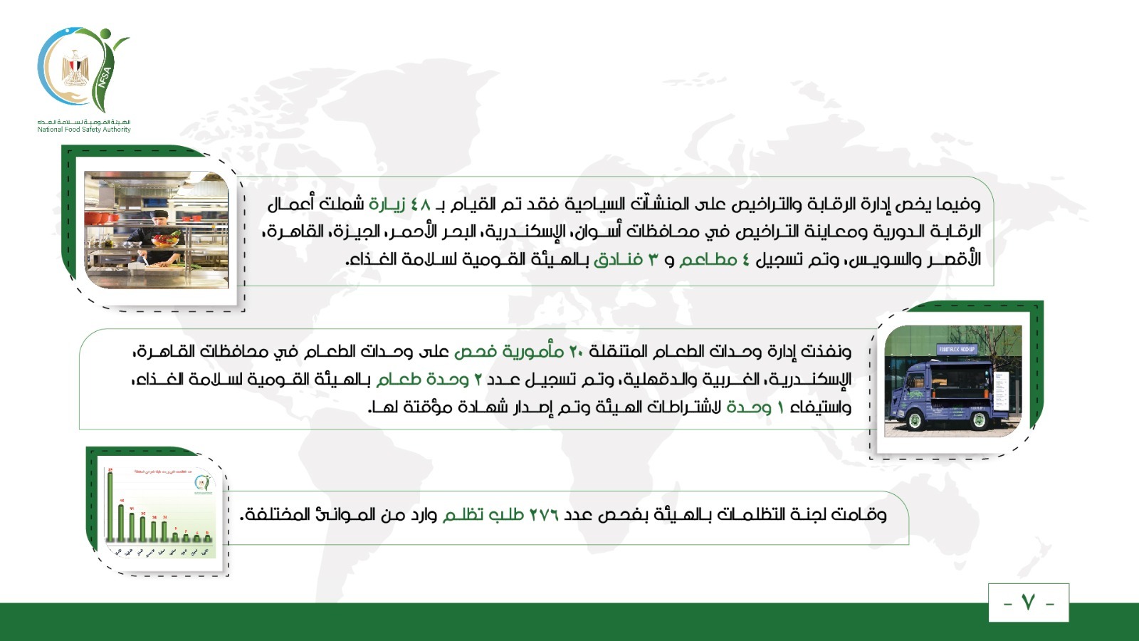 ونفذت إدارة وحدات الطعام المتنقلة 20 مأمورية فحص على وحدات الطعام في محافظات القاهرة، الإسكندرية، الغربية والدقهلية، وتم تسجيل عدد 2 وحدة طعام بالهيئة القومية لسلامة الغذاء، واستيفاء 1 وحدة لاشتراطات الهيئة وتم إصدار شهادة مؤقتة لها.