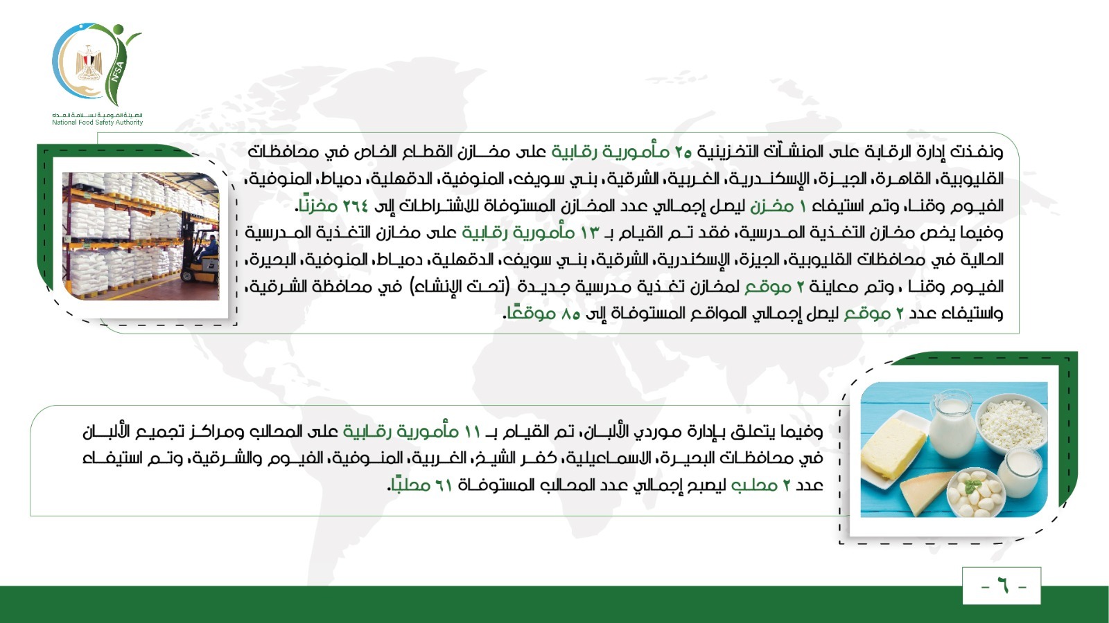 وفيما يخص مخازن التغذية المدرسية، فقد تم القيام بـ 13 مأمورية رقابية على مخازن التغذية المدرسية الحالية في محافظات القليوبية، الجيزة، الإسكندرية، الشرقية، بني سويف، الدقهلية، دمياط، المنوفية، البحيرة، الفيوم وقنا ، وتم معاينة 2 موقع لمخازن تغذية مدرسية جديدة (تحت الإنشاء) في محافظة الشرقية، واستيفاء عدد 2 موقع ليصل إجمالي المواقع المستوفاة إلى 85 موقعًا.