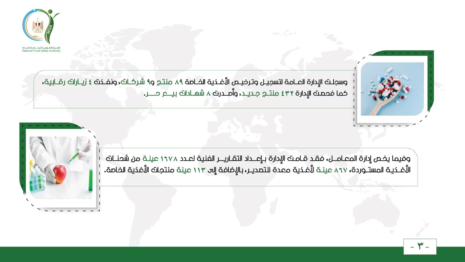 وسجلت الإدارة العامة لتسجيل وترخيص الأغذية الخاصة 89 منتج و9 شركات، ونفذت 4 زيارات رقابية، كما فحصت الإدارة 432 منتج جديد، وأصدرت 8 شهادات بيع حر.