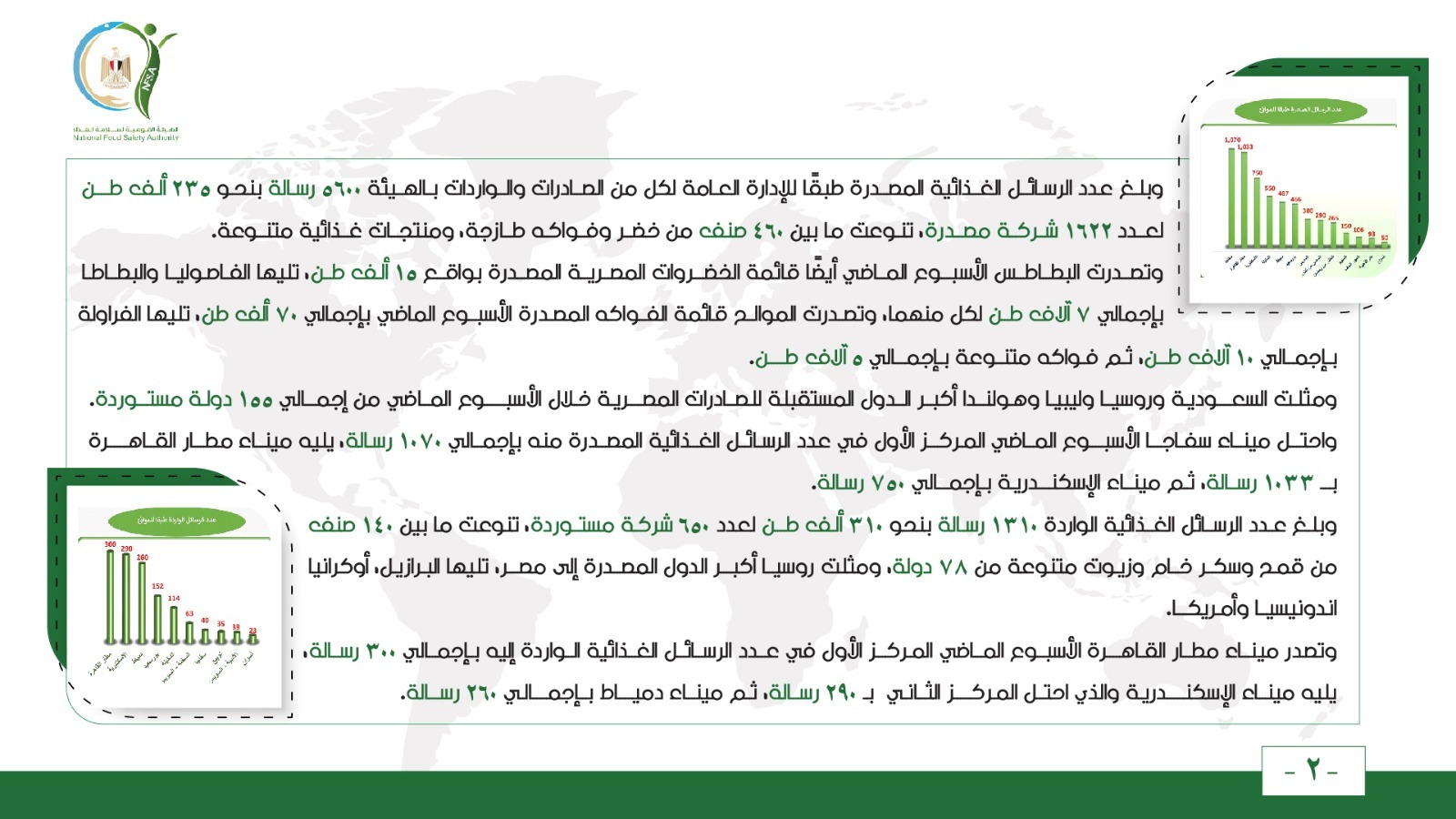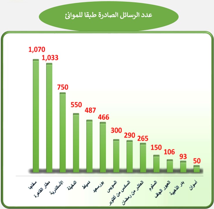 واحتل ميناء سفاجا الأسبوع الماضي المركز الأول في عدد الرسائل الغذائية المصدرة منه بإجمالي 1070 رسالة، يليه ميناء مطار القاهرة بـ 1033 رسالة، ثم ميناء الإسكندرية بإجمالي 750 رسالة.