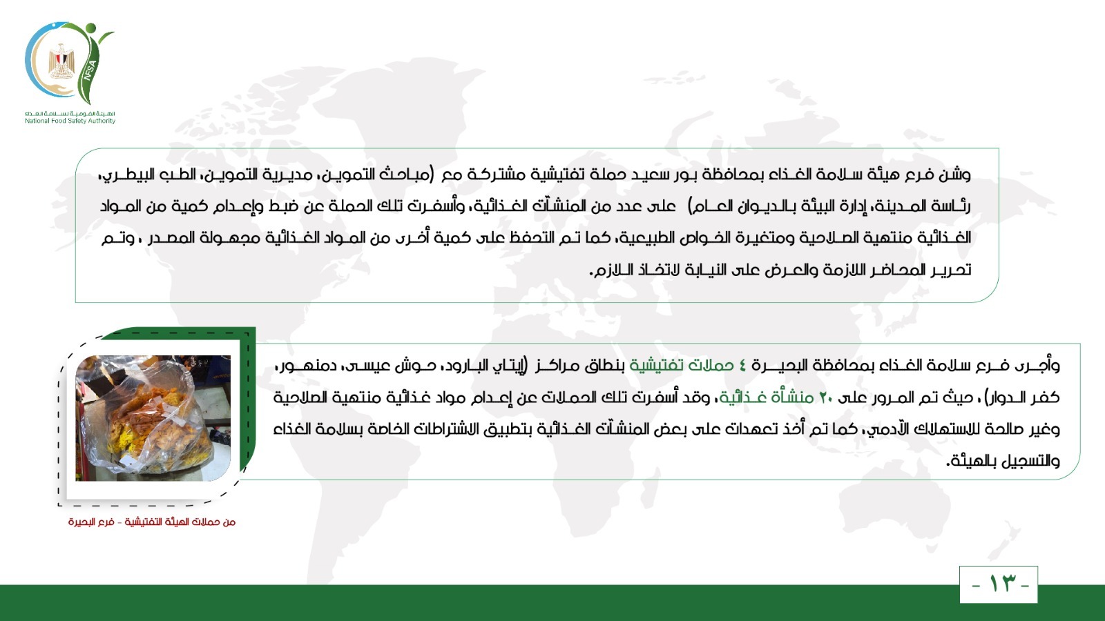 وتم الاشتراك في حملات مكبرة مع المحافظة ومديرية التموين ومباحث التموين ومديرية الطب البيطري ومديرية الصحة، وأسفرت تلك الحملات عن تحرير 146 محضرًا، تنوعت مابين محاضر ضبط وسحب عينات ونقص اشتراطات صحية لكمية من المواد الغذائية تقدر بـ 4 طن (لحوم، دواجن، رنجة) وذلك ضمن الحملات اليومية لضبط الأسواق، وتم سحب عينات للأغذية التي يشتبه في صلاحيتها للاستخدام، والتحفظ على جميع المضبوطات لاتخاذ الإجراءات القانونية، كما تم فحص الأغذية بمراكز التأهيل والإصلاح.
