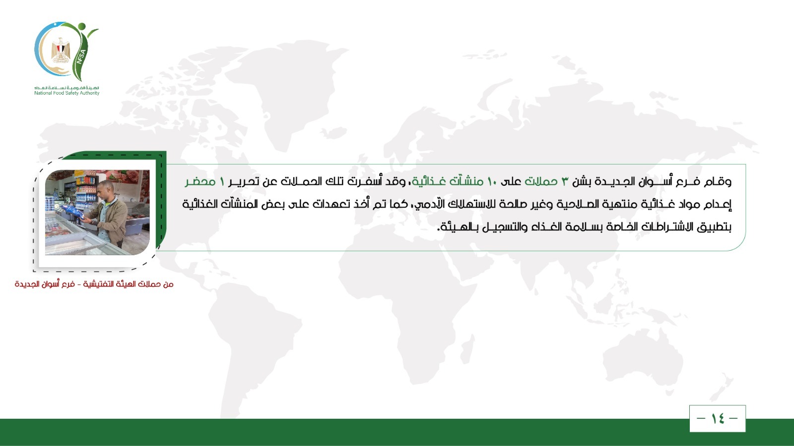 وقام فرع أسوان الجديدة بشن 3 حملات على 10 منشآت غذائية، وقد أسفرت تلك الحملات عن تحرير 1 محضر إعدام مواد غذائية منتهية الصلاحية وغير صالحة للاستهلاك الآدمي، كما تم أخذ تعهدات على بعض المنشآت الغذائية بتطبيق الاشتراطات الخاصة بسلامة الغذاء والتسجيل بالهيئة.