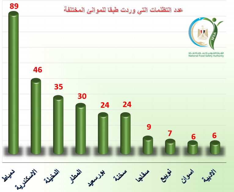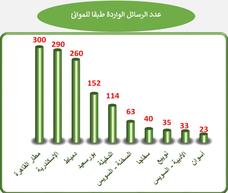 وتصدر ميناء مطار القاهرة الأسبوع الماضي المركز الأول في عدد الرسائل الغذائية الواردة إليه بإجمالي 300 رسالة، يليه ميناء الإسكندرية والذي احتل المركز الثاني بـ 290 رسالة، ثم ميناء دمياط بإجمالي 260 رسالة.