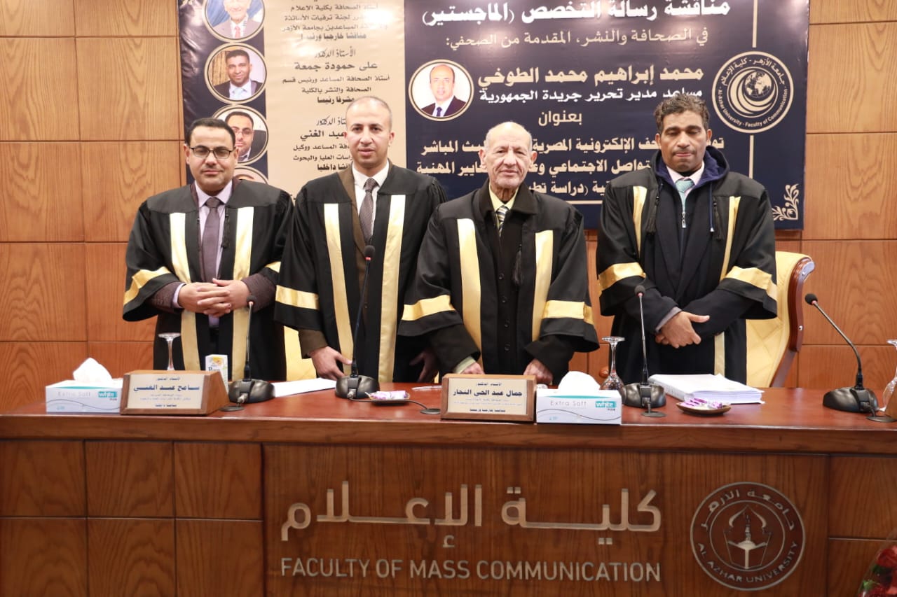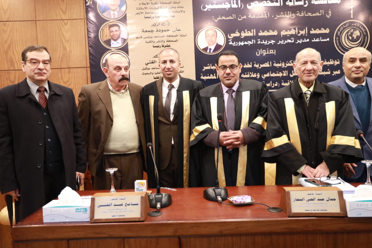 نوقشت بكلية الإعلام جامعة الأزهر رسالة تخصص (ماجستير) في الصحافة والنشر، للباحث محمد إبراهيم محمد الطوخي، مساعد مدير تحرير جريدة الجمهورية، وجاءت الرسالة بعنوان: "توظيف الصحـف الإلكترونية المصــرية لخدمة البث المباشر عبر شبكات التواصل الاجتماعي وعلاقته بالمعايير المهنية والأخلاقية- دراسة تطبيقية.، وقررت اللجنة منح الباحث درجة التخصص "الماجستير" في الصحافة والنشر بتقدير ممتاز.