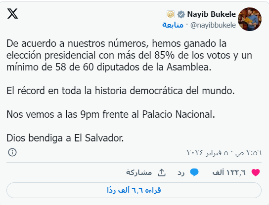 وكتب بوكيلة على منصة اكس: وفق أرقامنا فقد فزنا في الانتخابات الرئاسية بأكثر من 85% من الأصوات، قبل أن يبدأ بعد دقائق إطلاق الألعاب النارية في العاصمة سان سلفادور.