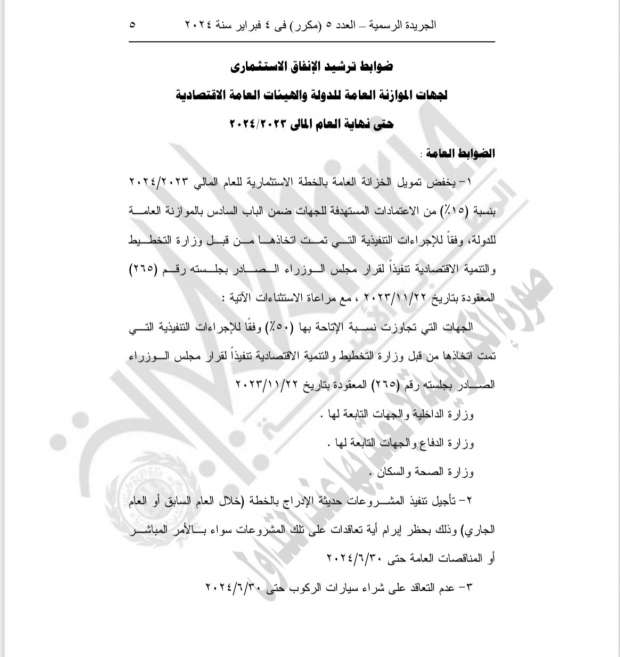 ذكرت الجريدة الرسمية أن قرار رئيس الوزراء جاء «بعد الإطلاع على الدستور ؛ وعلى قانون المالية العامة الموحد الصادر بالقانون رقم ٦ لسنة ۲۰۲۲ ؛وعلى القانون رقم 91 لسنة ۲۰۲۳ بربط الموازنة العامة للدولة للسنة المالية ٢٠٢٤/٢٠٢٣ ؛ وعلى القانون رقم ۹۲ لسنة ۲۰۲۳ باعتماد خطة التنمية الاقتصادية والاجتماعية للسنة المالية ٢٠٢٤/٢٠٢٣، وعلى قوانين ربط موازنات الهيئات العامة الاقتصادية للعام المالي ٢٠٢٤/٢٠٢٣ ؛ وعلى قرار رئيس مجلس الوزراء رقم ٤٤٩٩ لسنة ۲۰۲۳ بشأن ترشيد الإنفاق العام بالجهات الداخلة في الموازنة العامة للدولة والهيئات العامة الاقتصادية في ظل الأزمة الاقتصادية الحالية ؛ وعلى ما قرره مجلس الوزراء بجلسته رقم (٢٦٥) المعقودة بتاريخ ۲۰۲۳/۱۱/۲۲ ؛ وبناءً على ما عرضته وزيرة التخطيط والتنمية الاقتصادية.