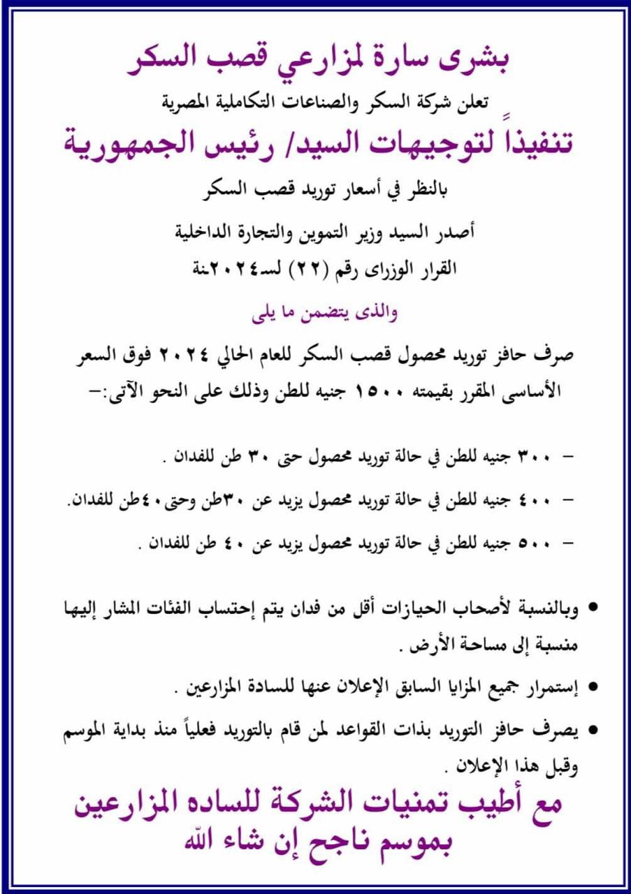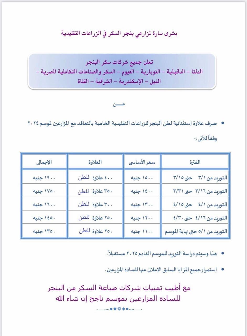 وكذلك صرف 1600 جنيها للطن عن توريد محصول البنجر خلال الفترة من 1 أبريل وحتى 15 أبريل 2024 وتتضمن (1300 جنيهاً سعر أساسي و300 جنيه علاوة للطن).