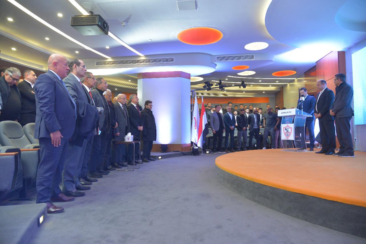 حرص أحمد سليمان عضو مجلس إدارة نادي الزمالك على مطالبة جميع الحضور بالمؤتمر الصحفي لتقديم الصفقات الجديدة في كافة الألعاب المختلفة، على الوقوف دقيقة حداد على أرواح شهداء النادي الأبيض في حادث ستاد الدفاع الجوي.