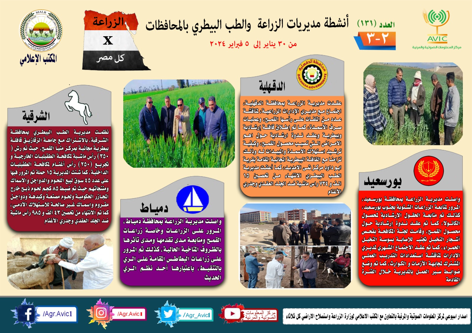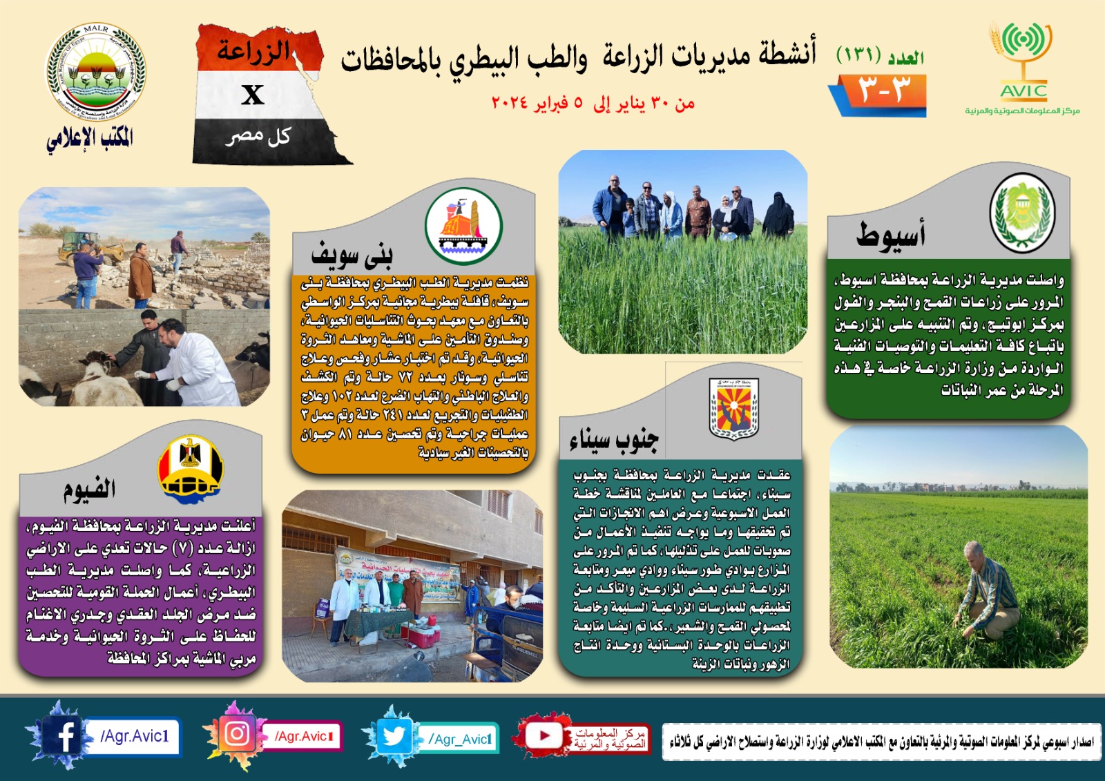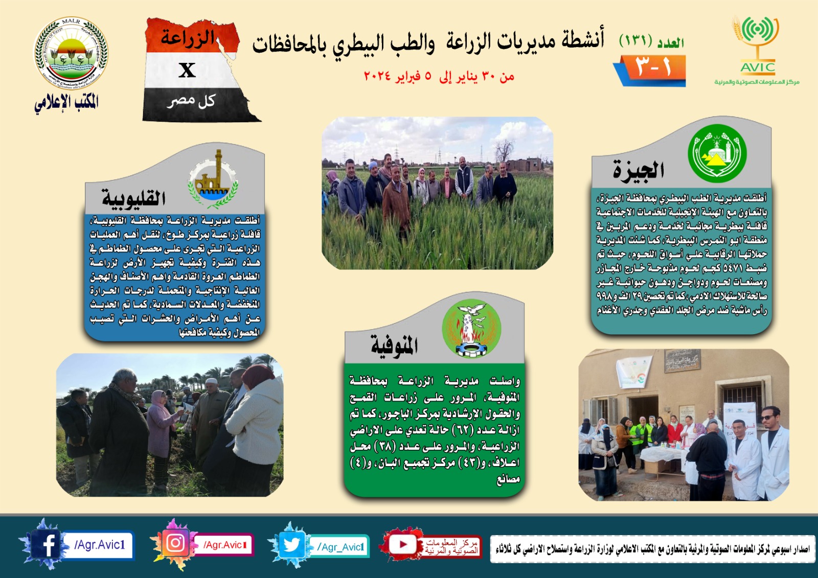 أصدر مركز المعلومات الصوتية والمرئية التابع لوزارة الزراعة واستصلاح الأراضي، والمكتب الاعلامي للوزارة، العدد رقم 131 من اصدار: "الزراعة في كل مصر" بالانفوجراف والفيديو، يوضح الجهود والانشطة التي تقوم بها مديريات الزراعة والطب البيطري بمحافظات الجمهورية خلال الفترة من 30 يناير وحتى 5 فبراير الجاري.