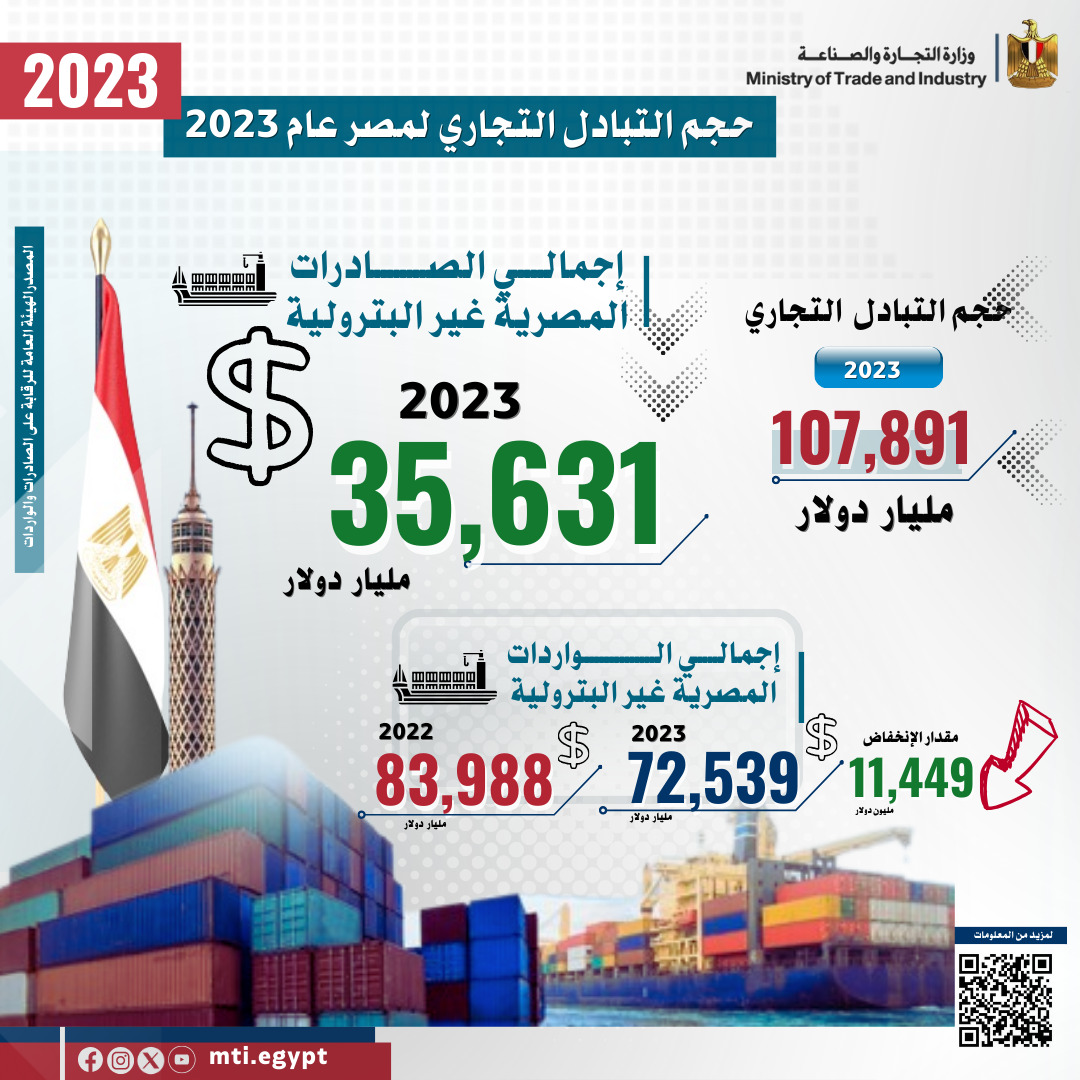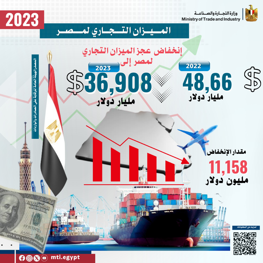 أعلن المهندس/ أحمد سمير وزير التجارة والصناعة أن الصادرات المصرية السلعية نجحت خلال عام 2023 في تحقيق معدلات نمو ملموسة تجاوزت مؤشرات عام 2022، وذلك رغم تتابع الأزمات الاقتصادية على الصعيدين الإقليمي والعالمي حيث سجلت صادرات مصر السلعية نحو 35 مليار و631 مليون دولار، مشيراً إلى أن عجز الميزان التجاري شهد انخفاضاً كبيراً بنحو 11 مليار و158 مليون دولار حيث سجل 36 مليار و908 مليون دولار مقابل 48 مليار و66 مليون دولار خلال عام 2022.