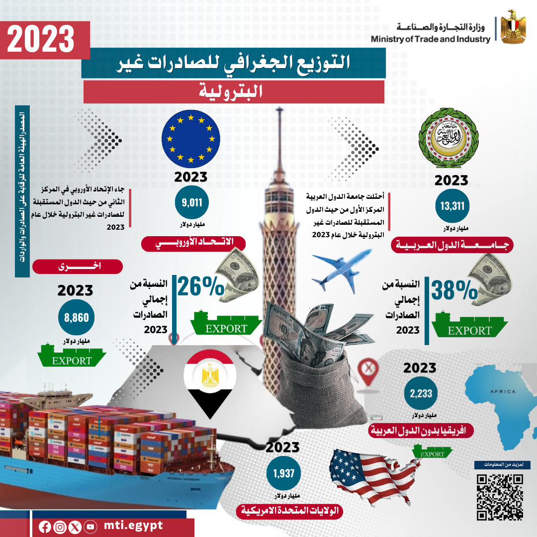 وفيما يتعلق بالتوزيع الجغرافي للصادرات السلعية المصرية خلال عام 2023، أوضح سمير أن الصادرات المصرية لدول القارة الافريقية بدون الدول العربية حققت زيادة ملموسة بنسبة 7% حيث بلغت 2 مليار و247 مليون دولار، مشيراً إلى أن الصادرات المصرية لدول جامعة الدول العربية بلغت 13 مليار و411 مليون دولار، والاتحاد الأوروبي بقيمة 9 مليار و50 مليون دولار، والولايات المتحدة الامريكية بقيمة مليار و966 مليون دولار وأسواق اخري بقيمة 8 مليار و957 مليون دولار.